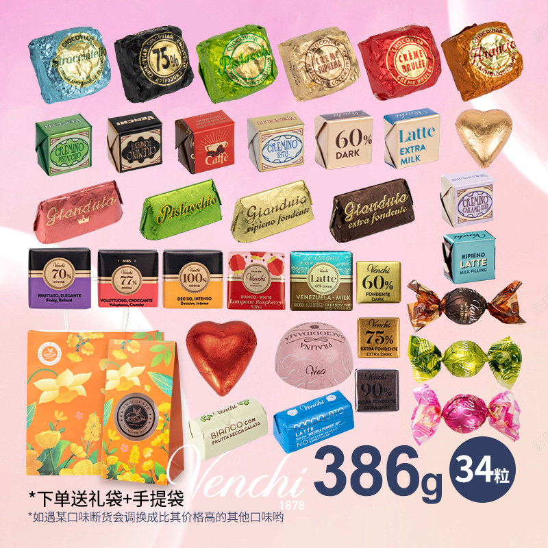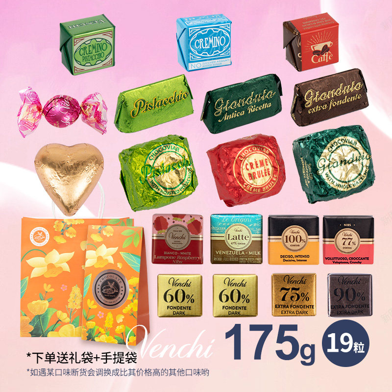 📚 包邮venchi巧克力鱼子酱意大利进口闻绮黑巧夹心多口味混合装礼袋