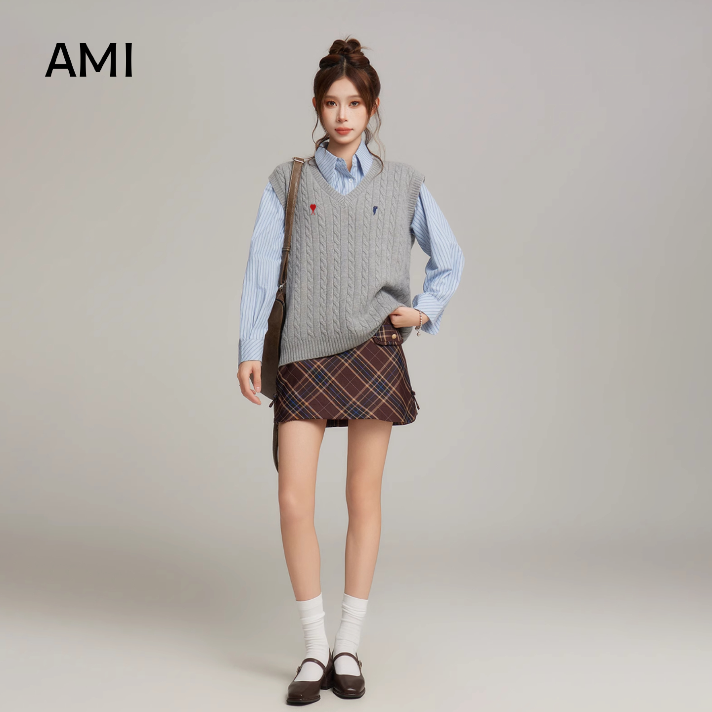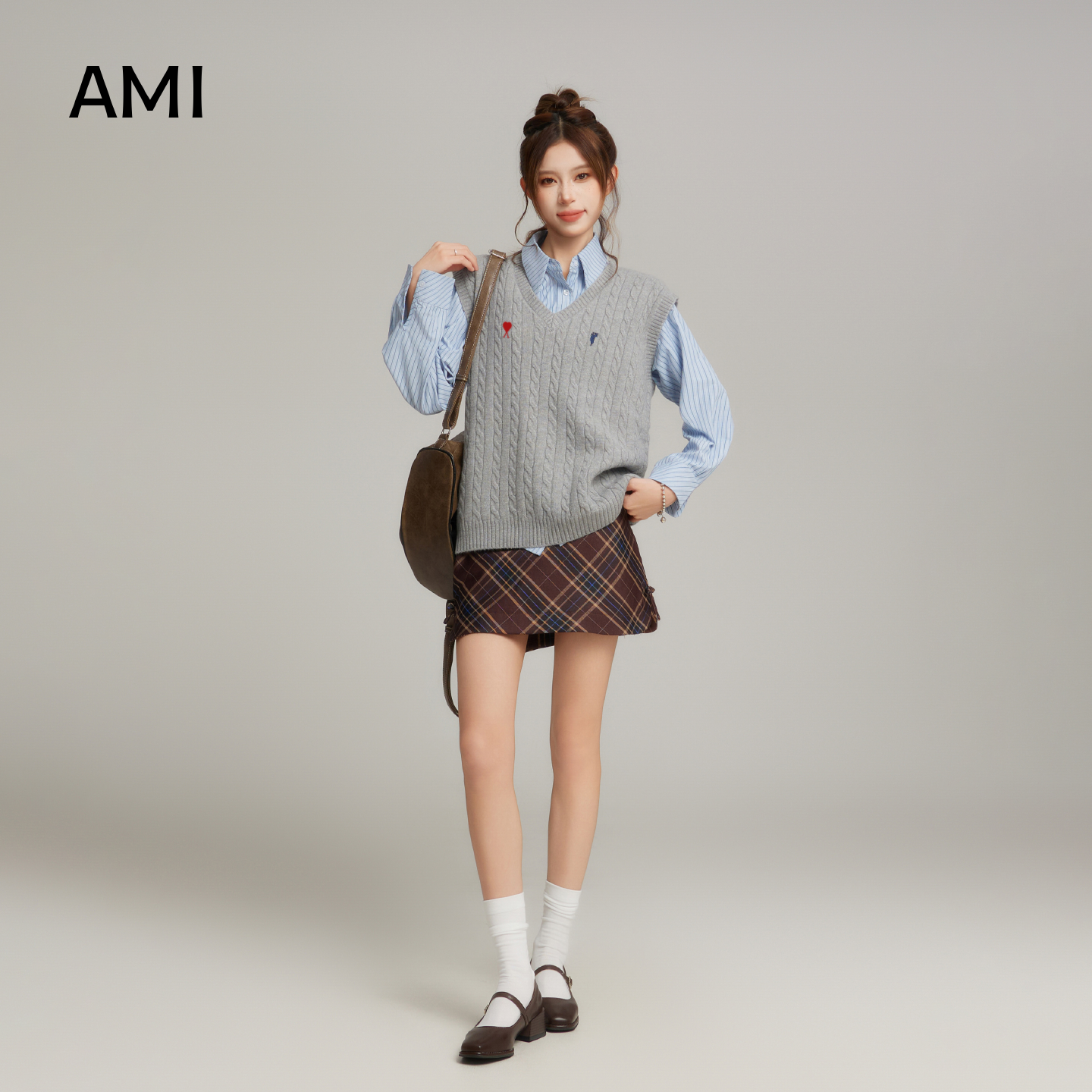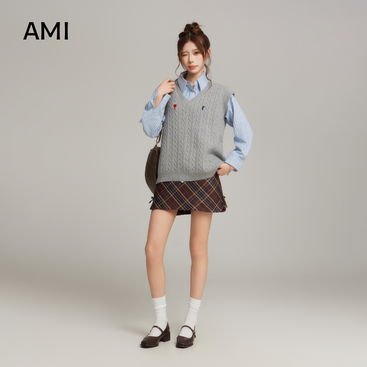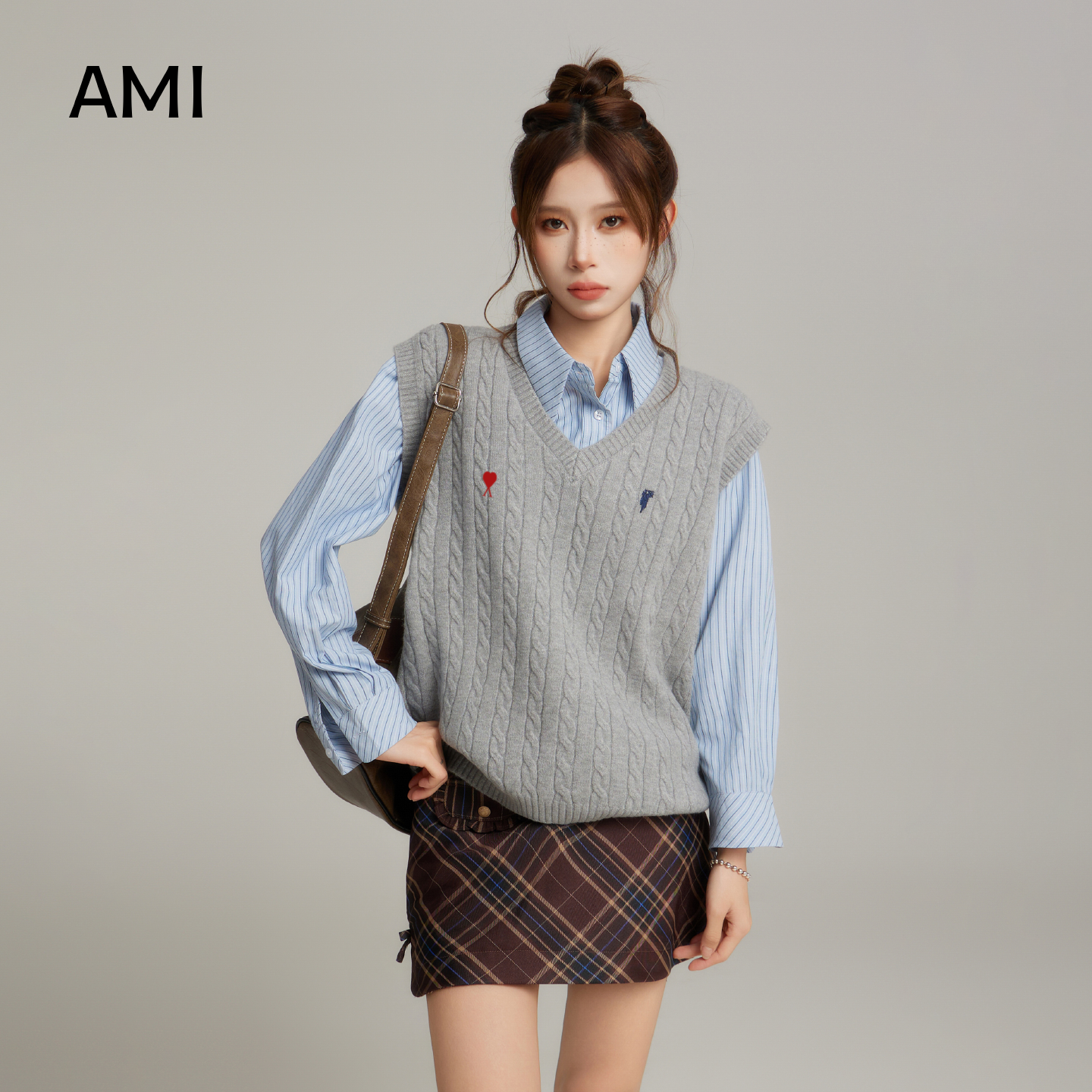 📚 AMI官方美式灰色v领针织马甲背心女春秋新款叠穿内搭无袖毛衣坎肩