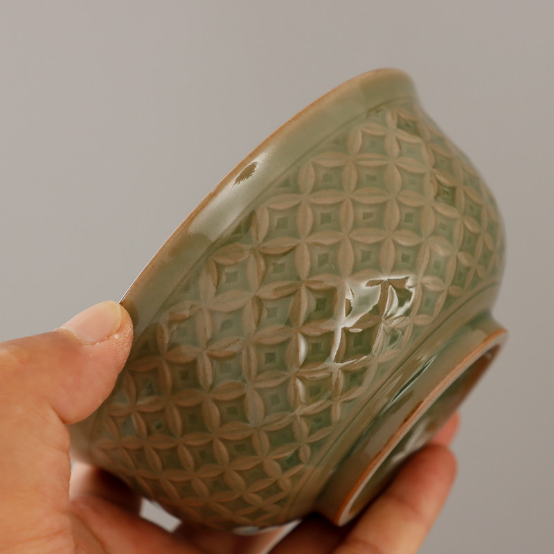 📚 微瑕耀州窑橄榄青釉印花中式复古传统粗陶窑变青瓷餐具小号米饭碗