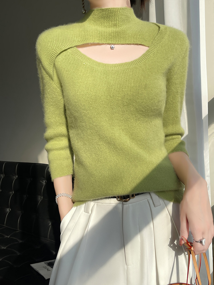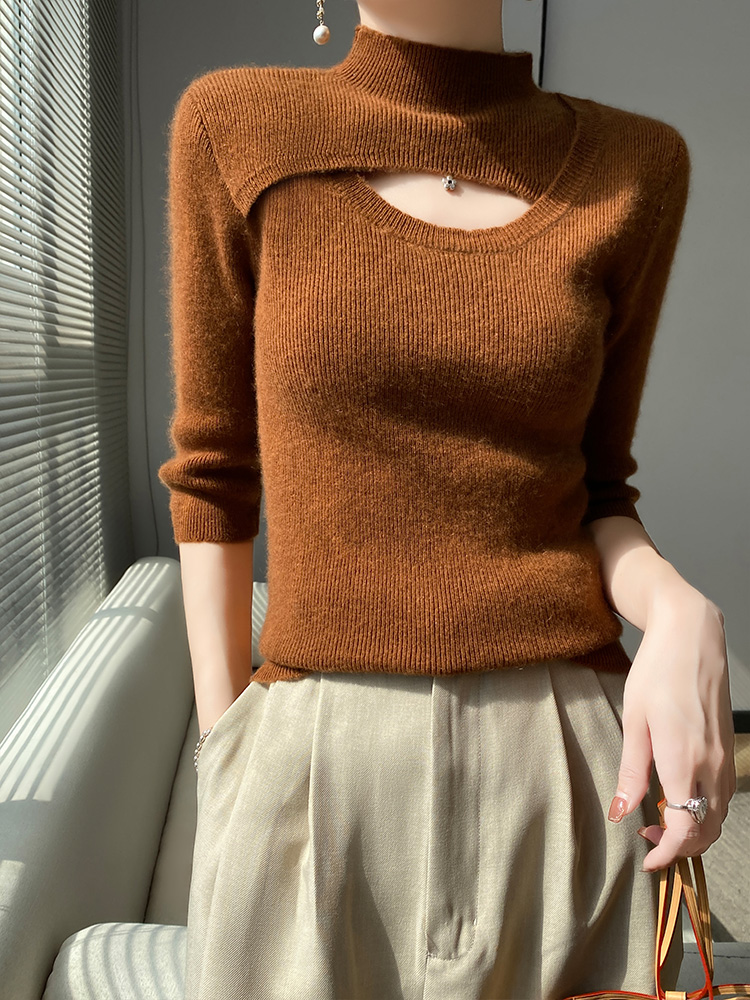 📚 精仿七分袖针织打底衫女半高领套头修身半袖毛衣性感气质外搭上衣