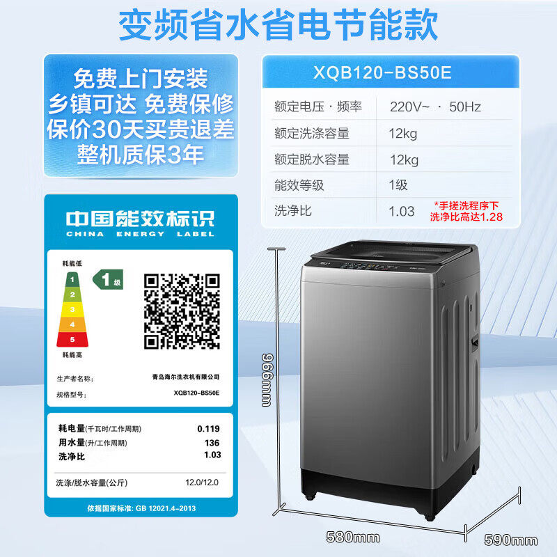 📚 海尔洗衣机全自动家用波轮10/12kg变频手搓洗防缠绕XQB100-BS50E