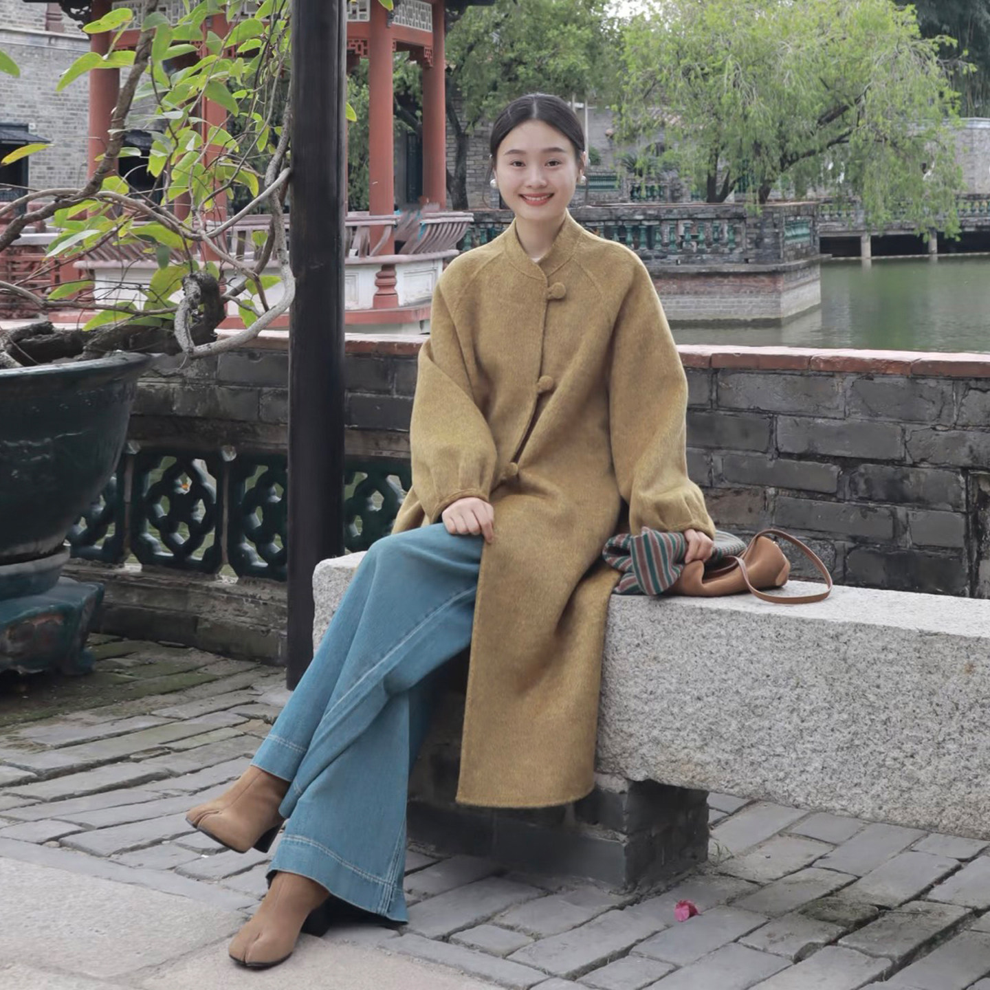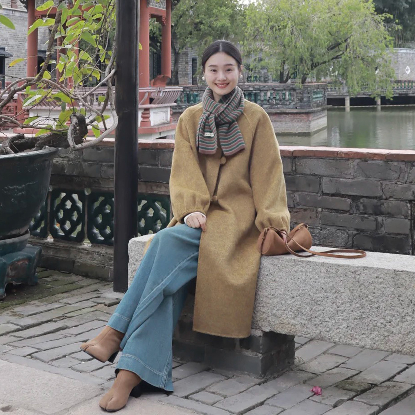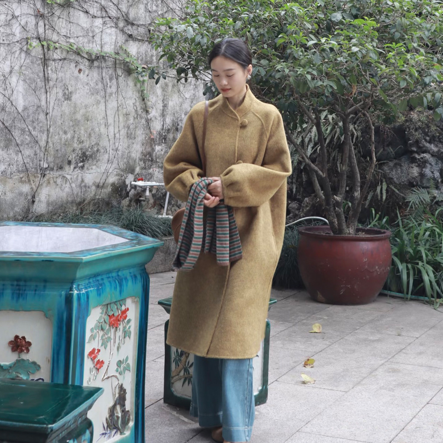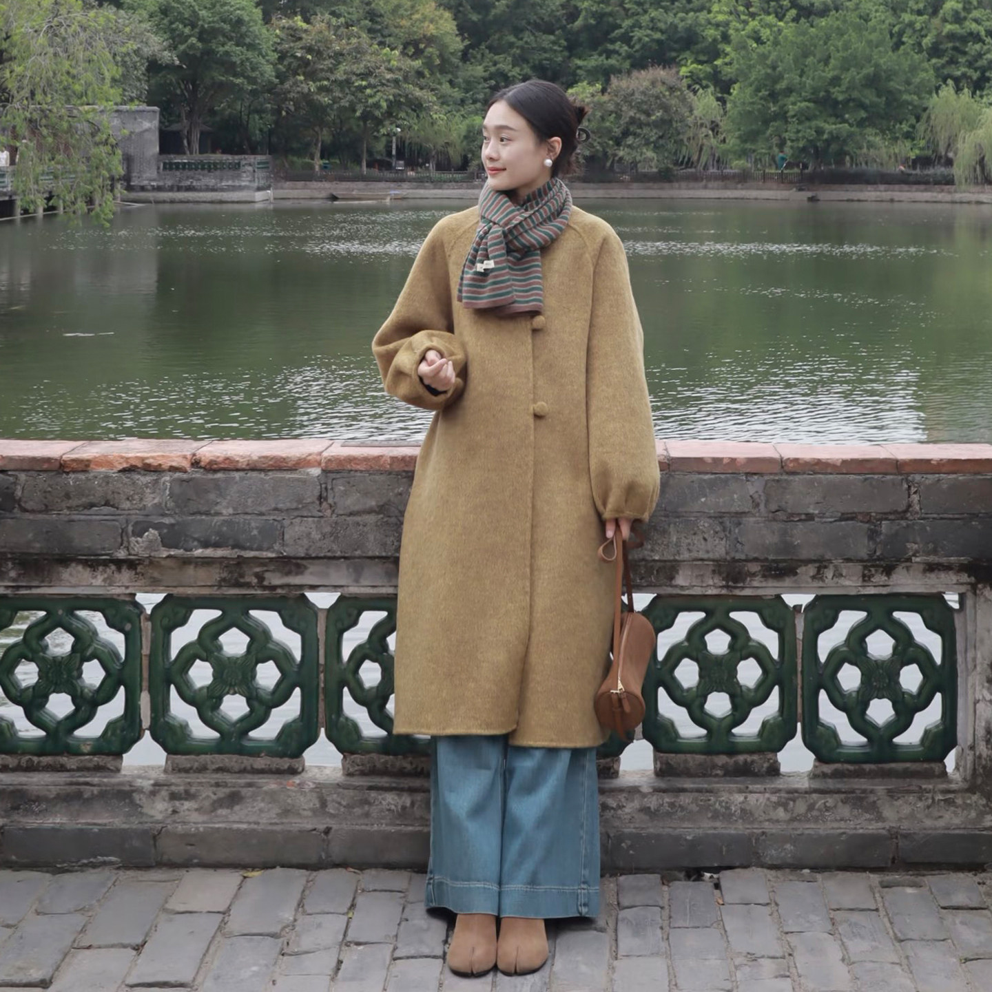 📚 复古秋叶黄立领宽松毛呢外套女秋冬季小个子灯笼袖中长款呢子大衣