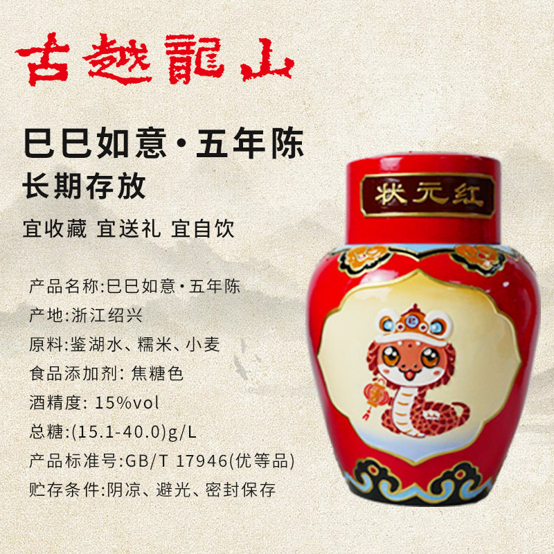 📚 古越龙山绍兴黄酒坛装花雕酒五年陈2.5L巳巳如意浮雕坛装糯米酒