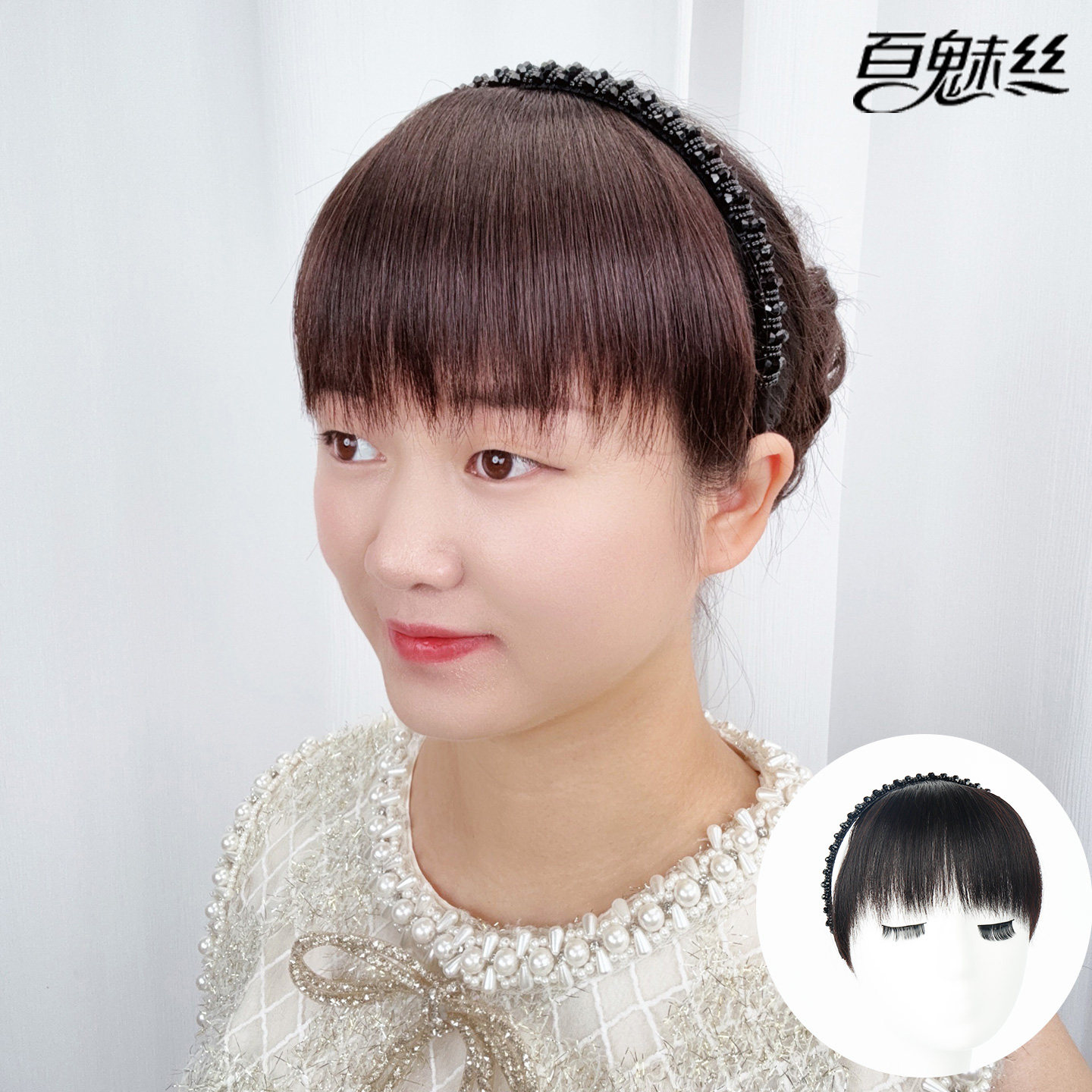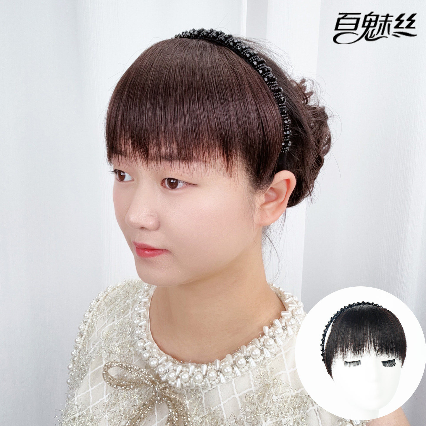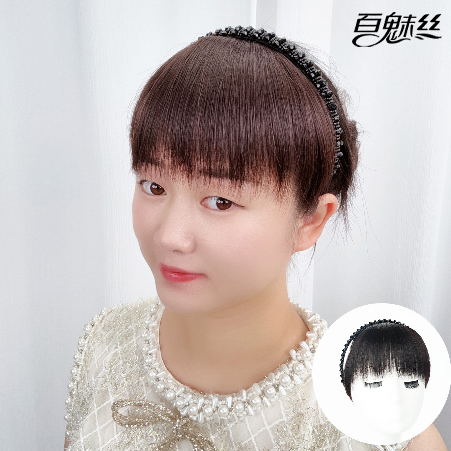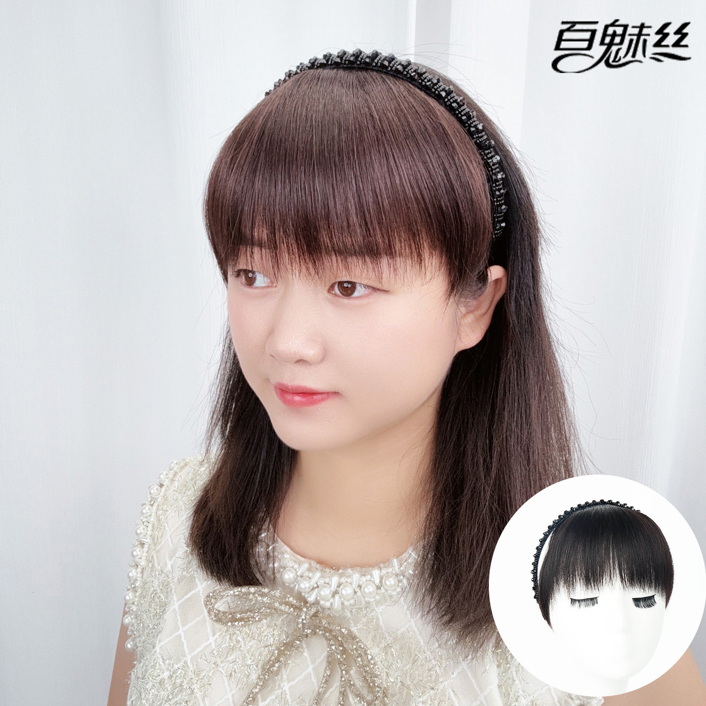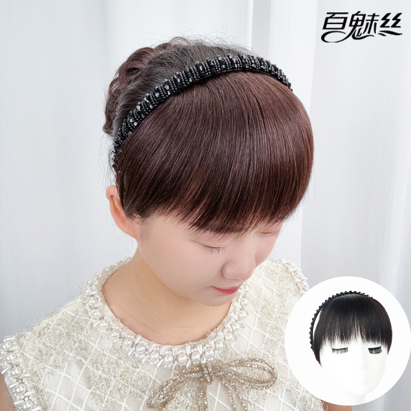 📚 百魅丝 黑色仿水钻发箍刘海一体全真发前额遮白发假发片头帘头箍