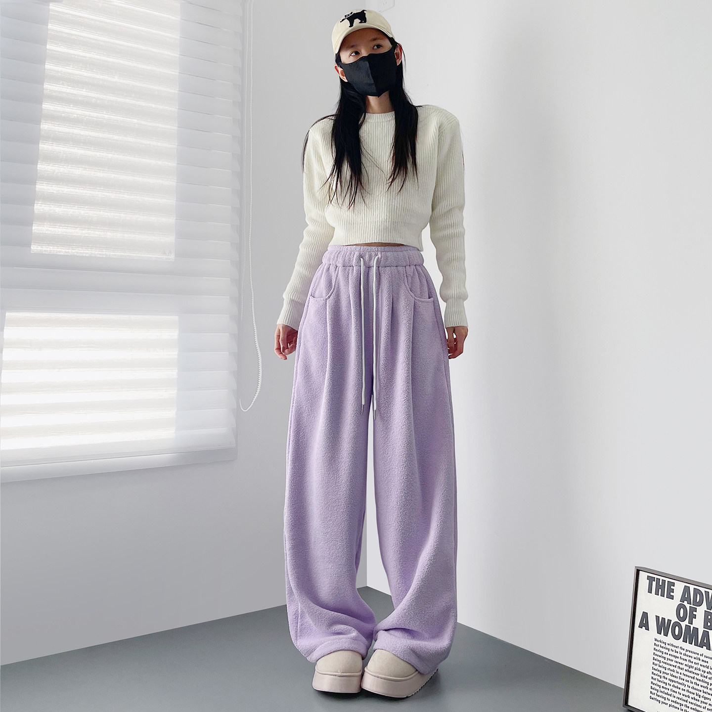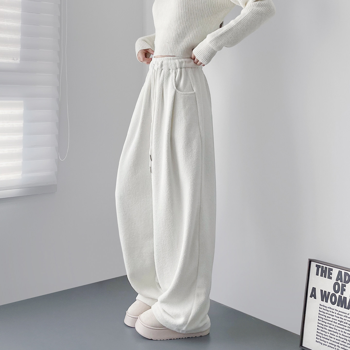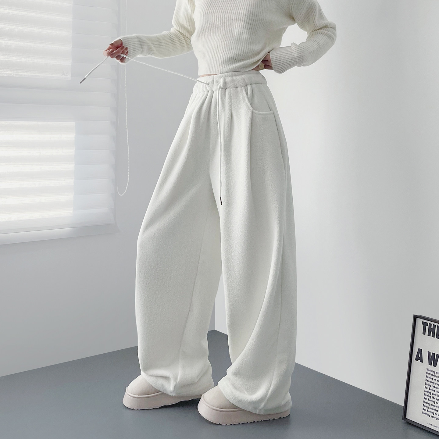 📚 大码白色奶芙仿羊绒毛毛裤女早春新款胖mm显瘦宽松毛绒阔腿卫裤子