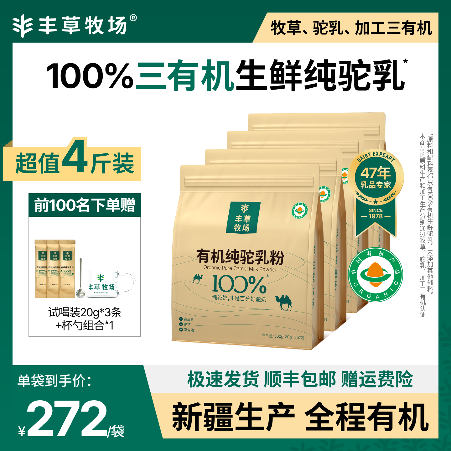 📚 【囤货超值】丰草牧场新疆100%三有机纯驼乳粉骆驼奶粉官方4袋装