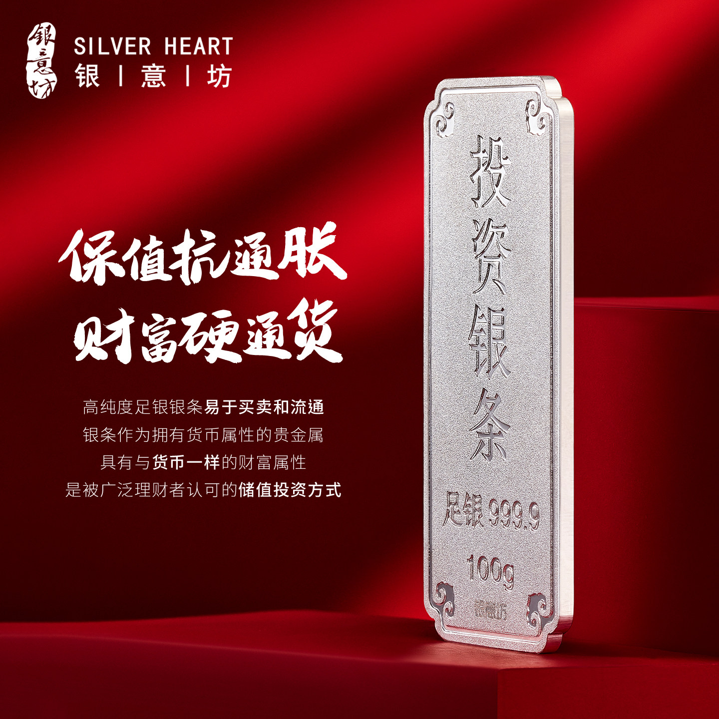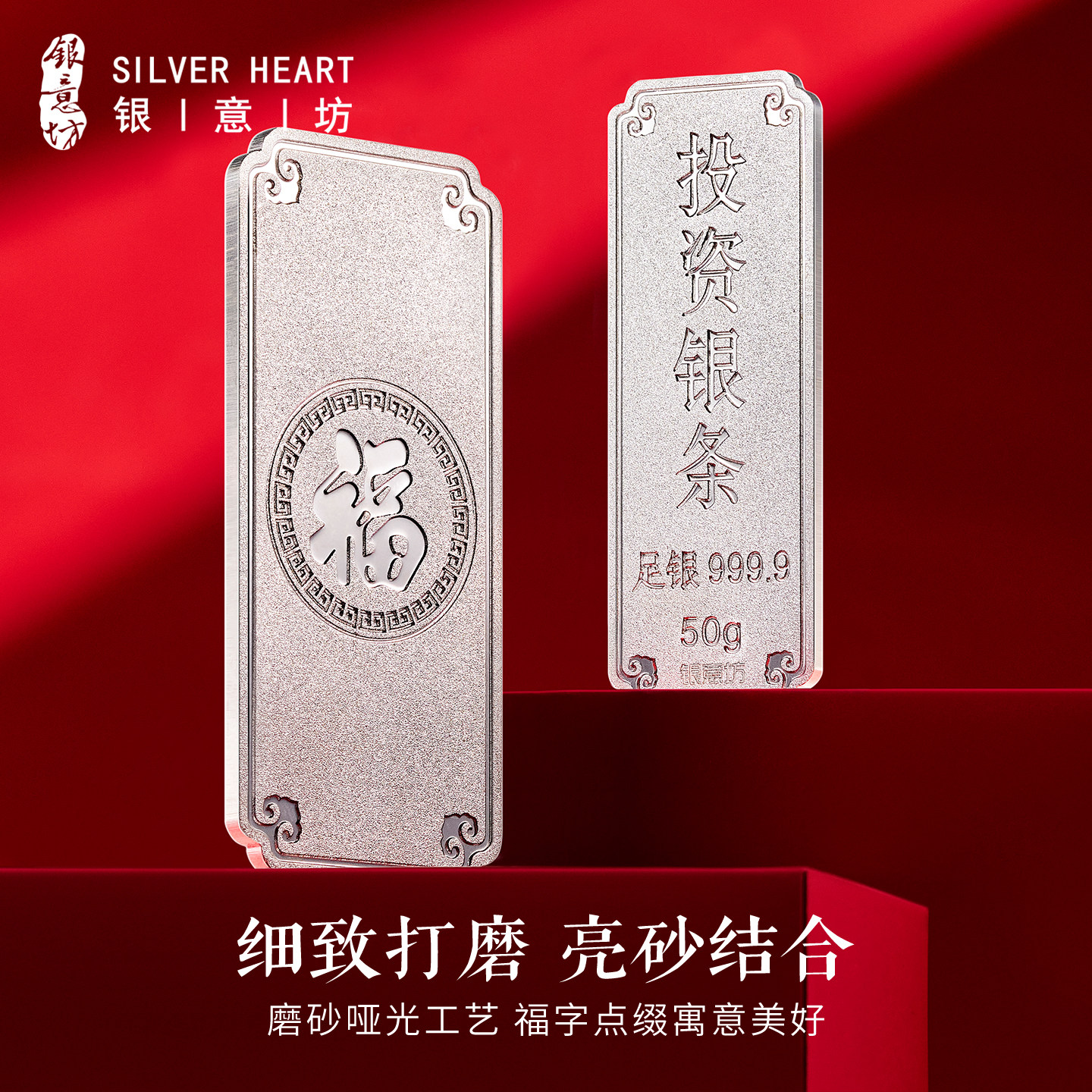 📚 银意坊银条白银纯银9999银条投资银元宝实心银砖100克50克银摆件