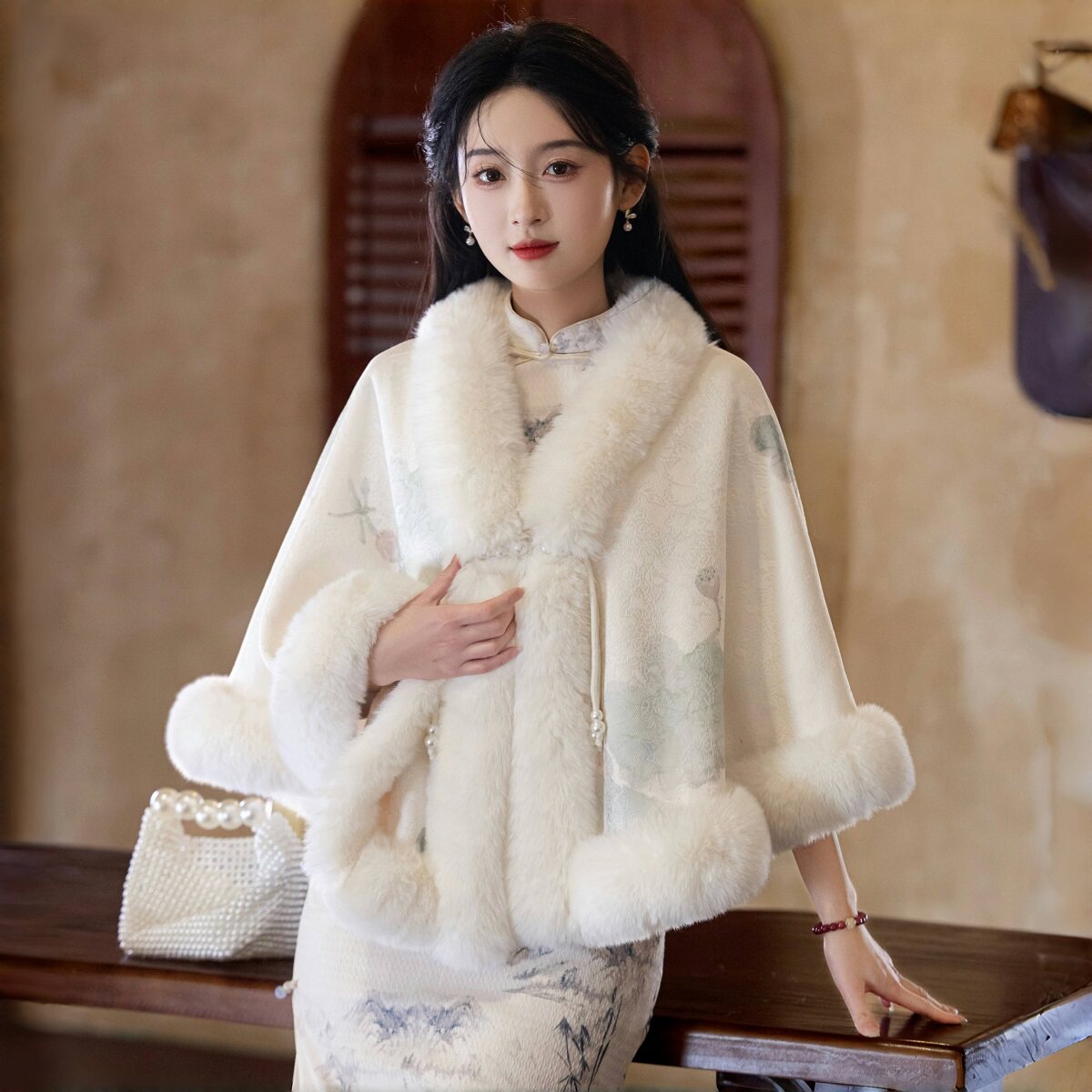 #冬季穿搭 #新中式风格 #艳莲白色毛披肩 #旗袍新款 #加绒加厚披风 #券后价129