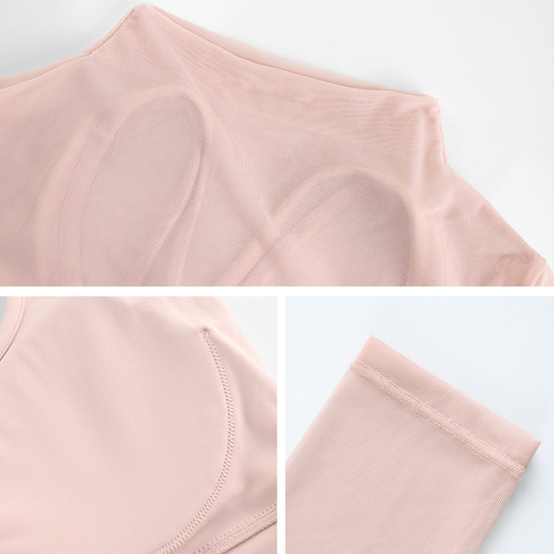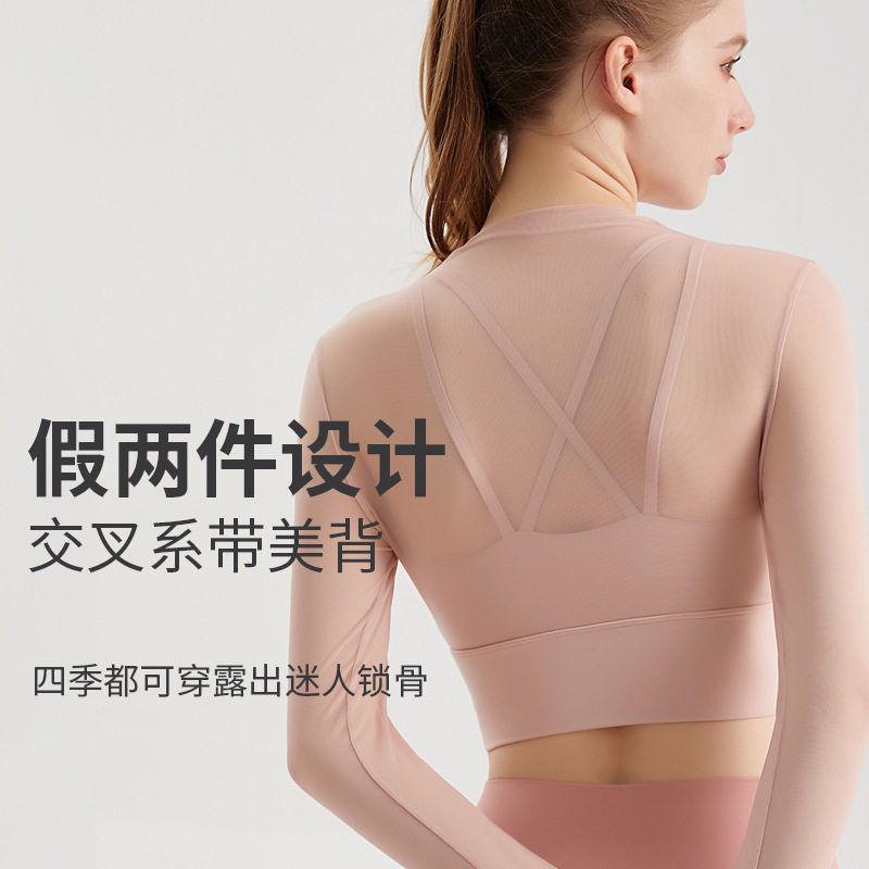 📚 威曼假两件瑜伽上衣女带胸垫交叉细吊带时尚网纱透气长袖健身服
