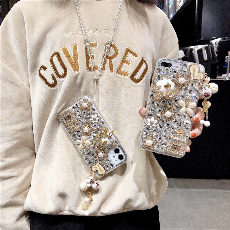 📚 南瓜车水钻适用iphone17air/16promax手机壳镶钻苹果13/14玻璃水晶钻石15pro珠子挂脖绳硅胶软壳保护壳新款女