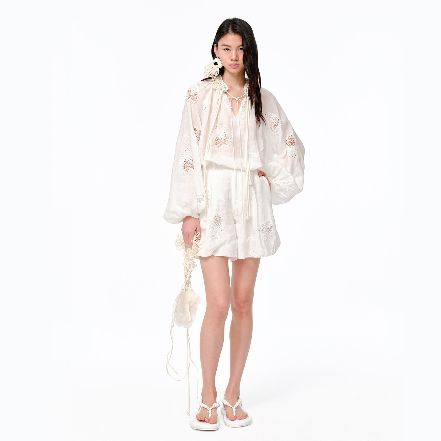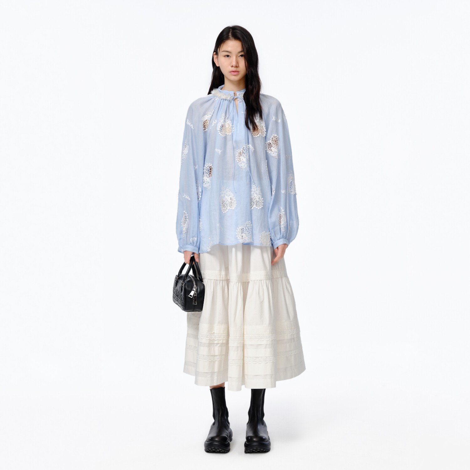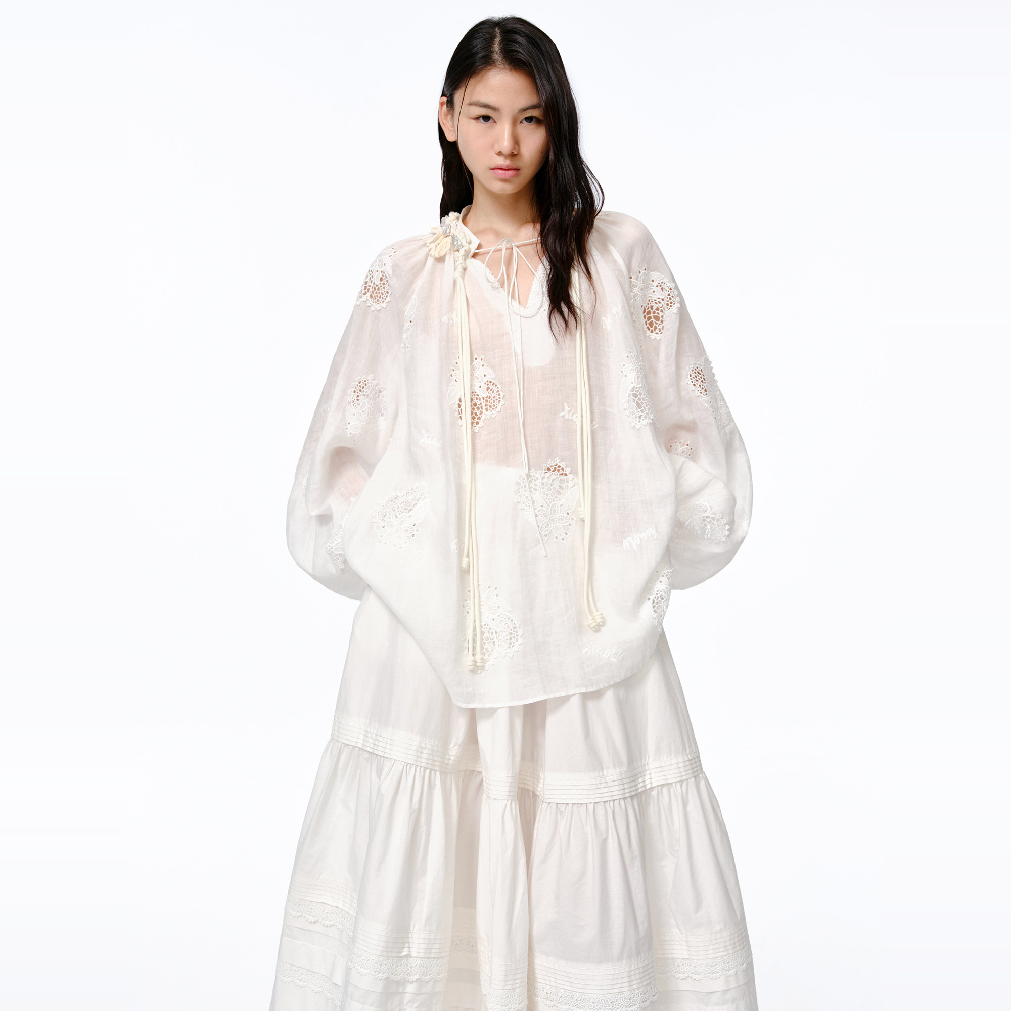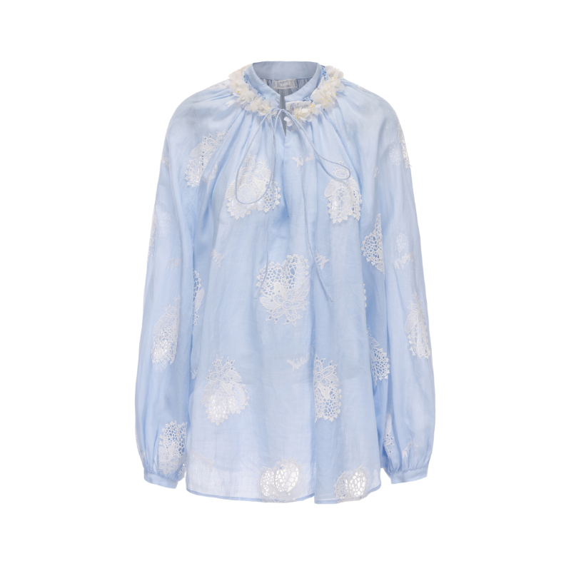 📚 【李冰冰同款】XIAOLI筱李25春夏柠檬刺绣镂空V领套头衬衫女蓝/白