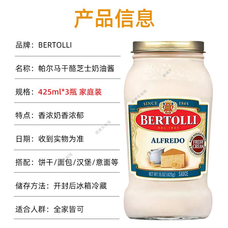 📚 美国直邮 Bertolli alfredo sauce芝士帕尔马奶酪调味酱425g*3瓶