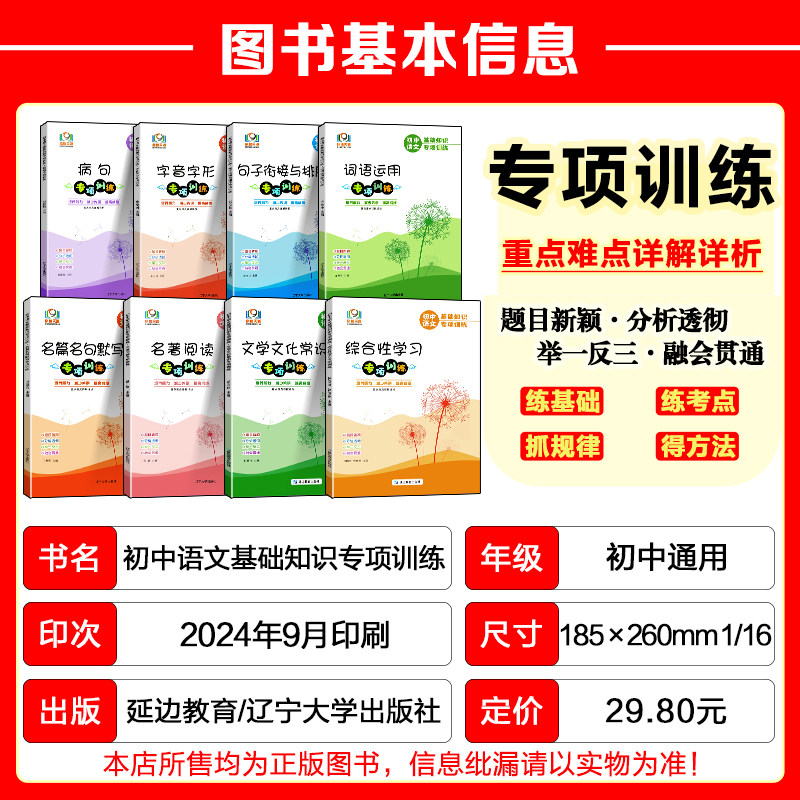 🌟券后价仅需13.8元,初中语文必备全套来啦!🎉 这是我们精心挑选的初中语文基础知识专项训练全套,涵盖了七八九年级词语运用、病句修改、字音字形、名句名篇、名著阅读、文学文化句子训练以及常识等综合性内容。