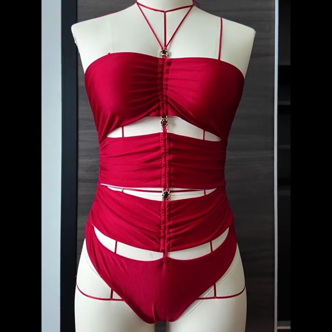 📚 腰部镂空挂脖连体泳衣欧美成熟风露背泳衣纯色高开叉泳装swimsuit