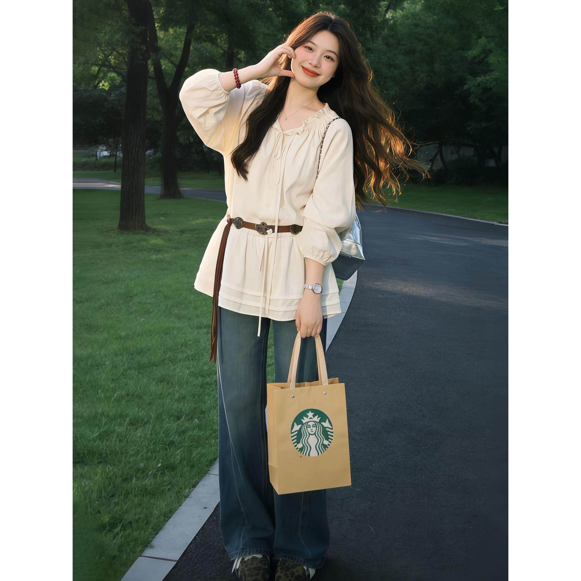 📚 杏色木耳边长袖衬衫配腰带女2026春季独特超好看时尚减龄收腰上衣