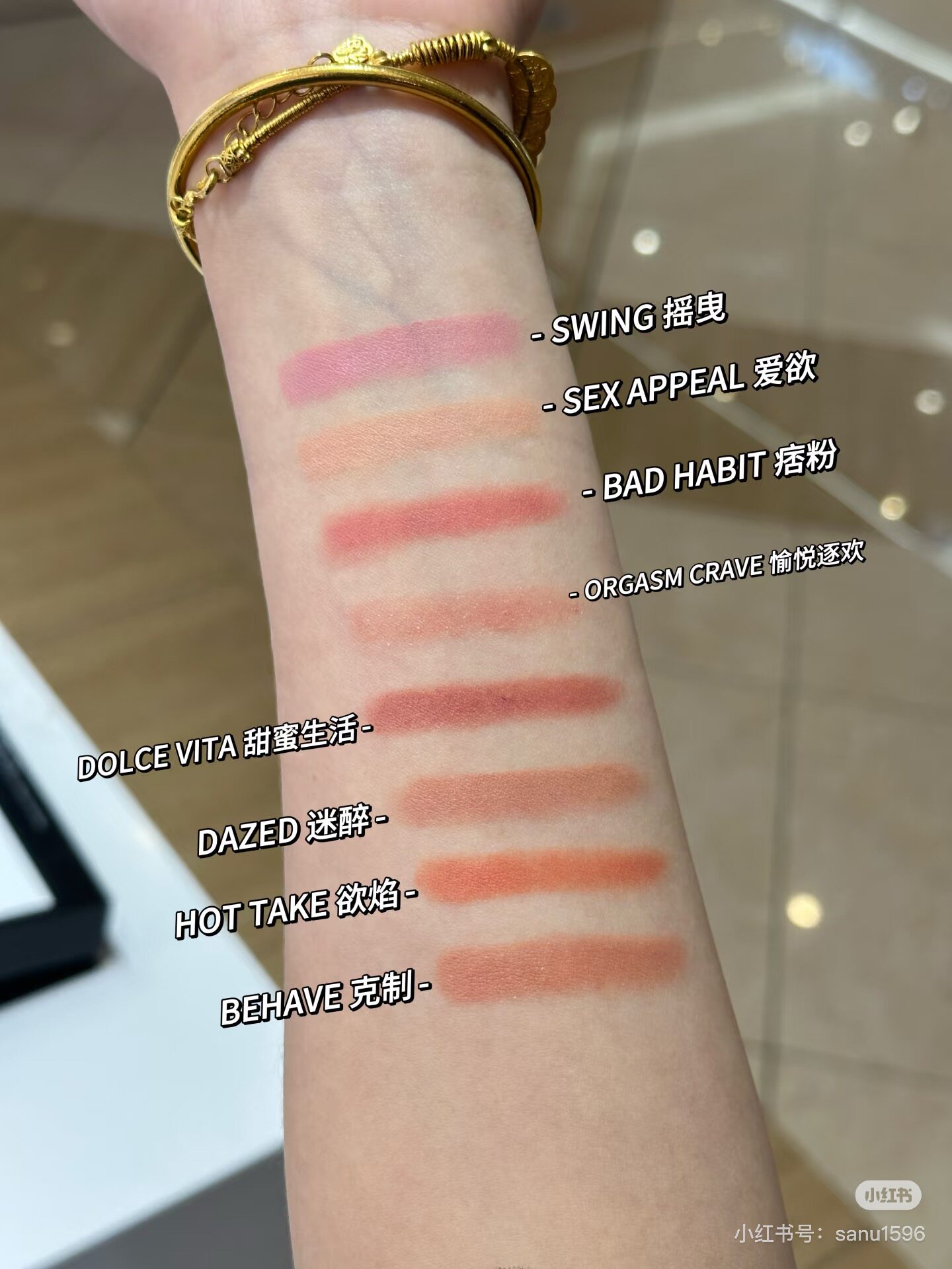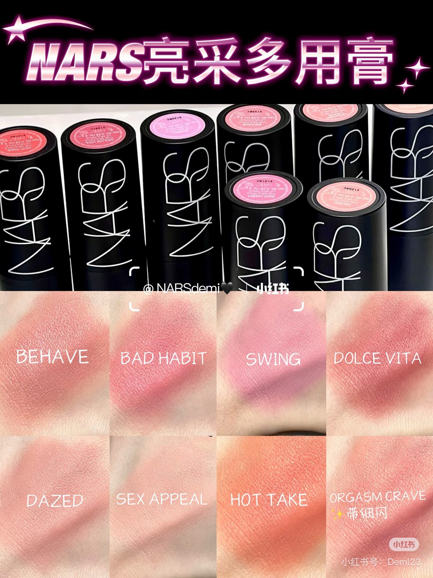 👀入手这款NARS纳斯腮红棒小样后,我迫不及待地开始了试色。这款腮红棒的色号丰富多样,既有sex appeal的诱惑力,又有behave的稳重感,还有swing的活泼气息。每次轻轻一抹,就能轻松打造出不同的妆容效果。