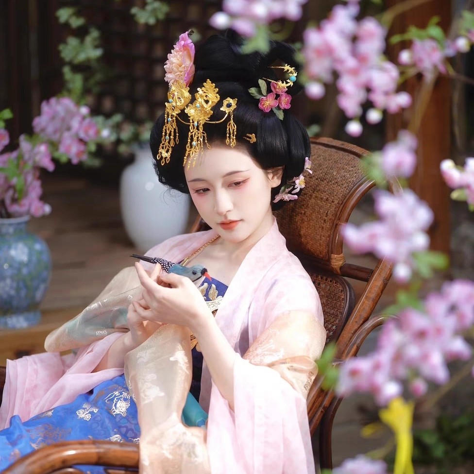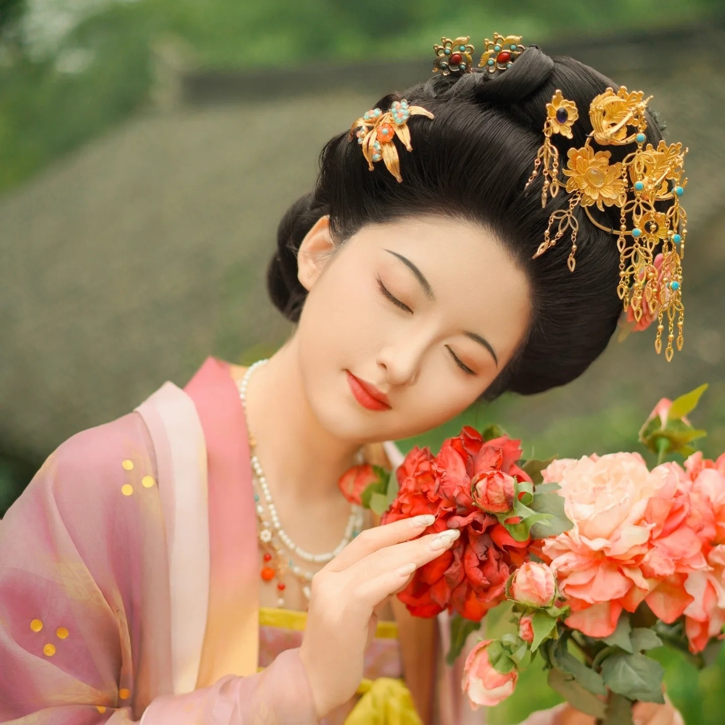 📚 镀真金发冠仿唐簪花仕女图流苏发簪凤凰发钗唐代汉服发饰金色发簪