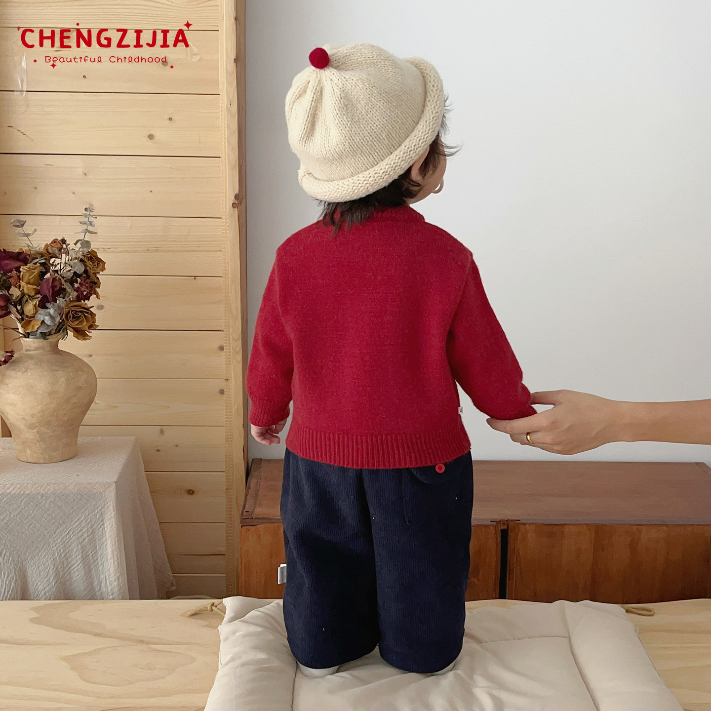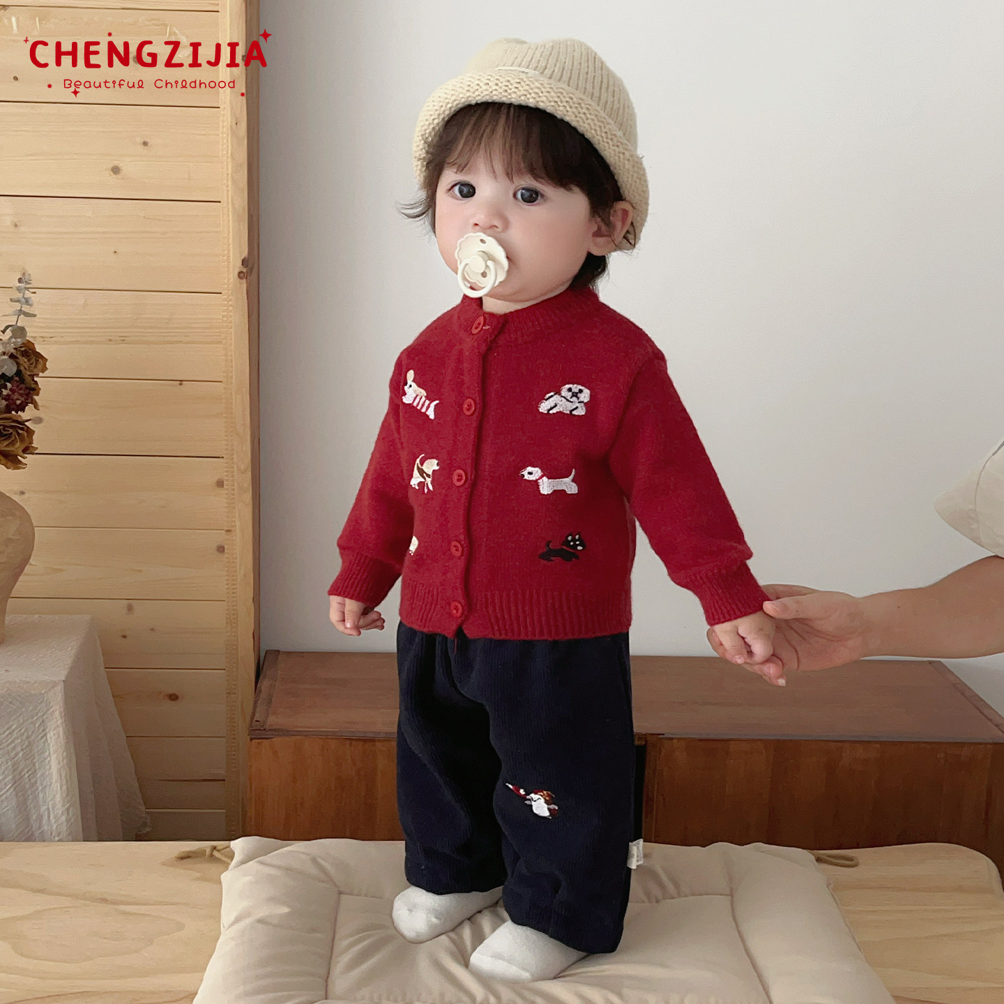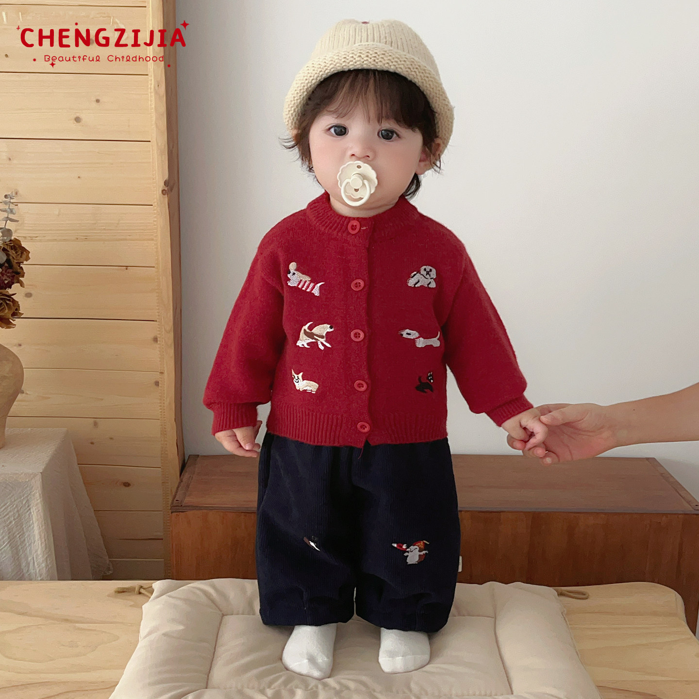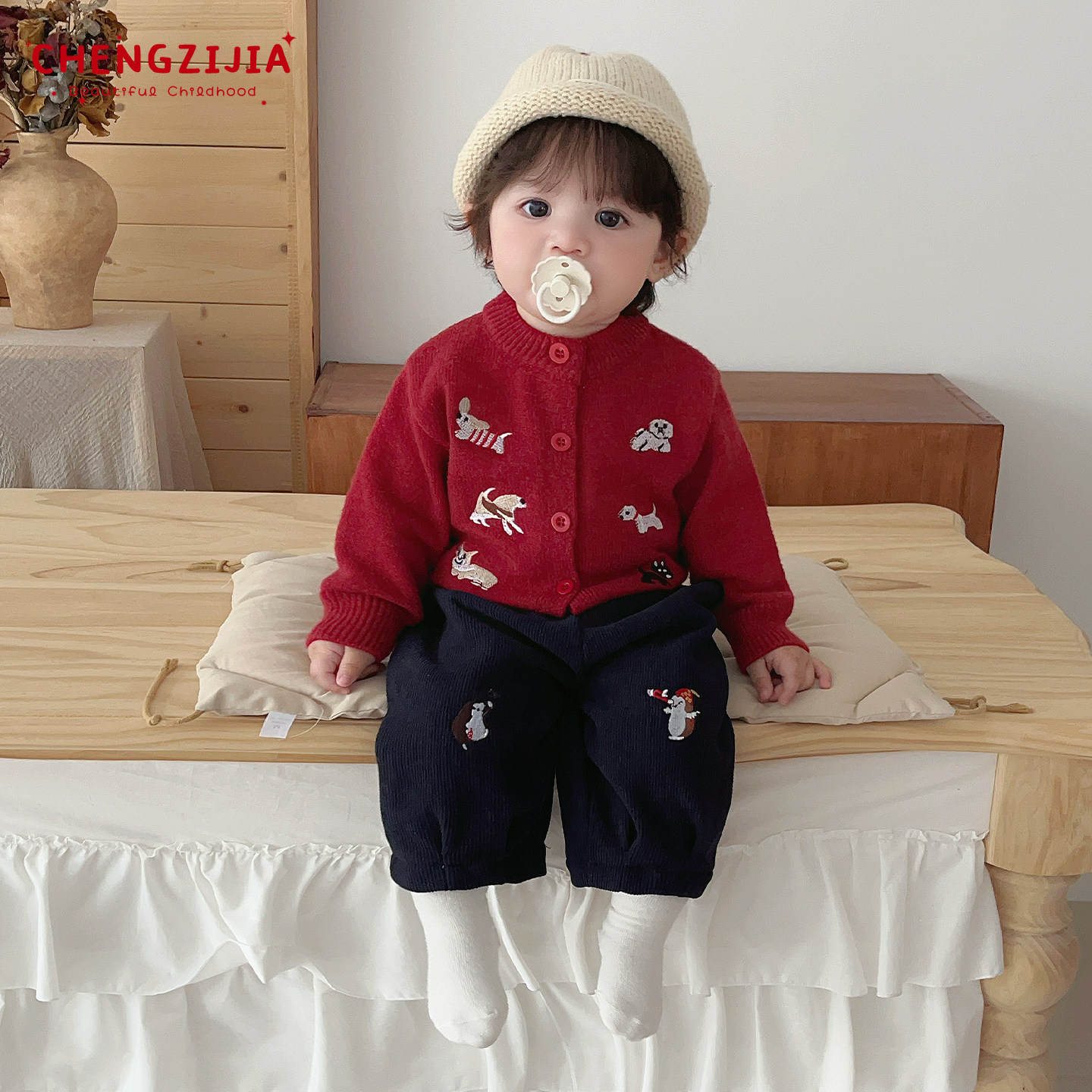 📚 男宝宝冬季针织开衫套装男童新年韩版加厚保暖毛衣婴儿加绒直筒裤