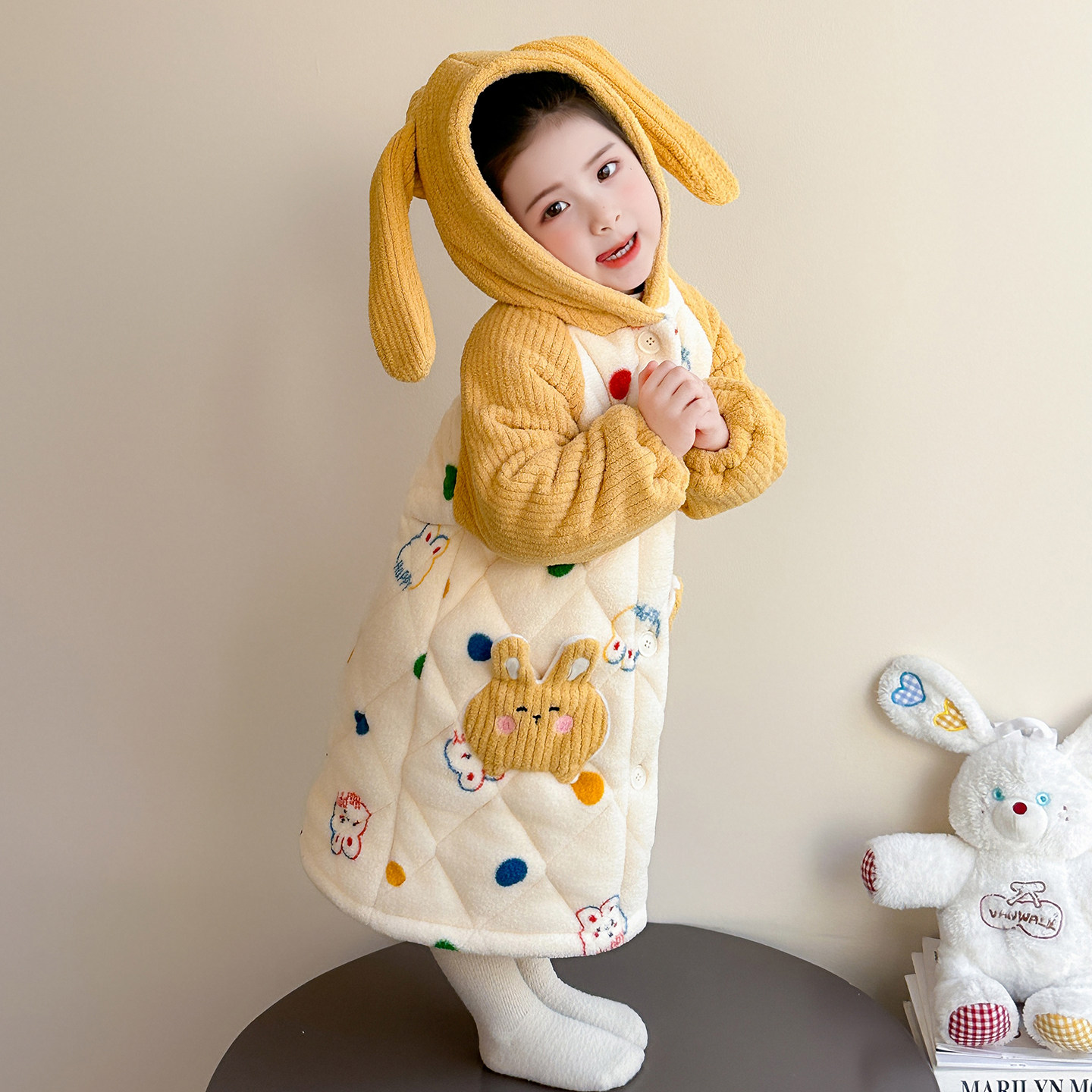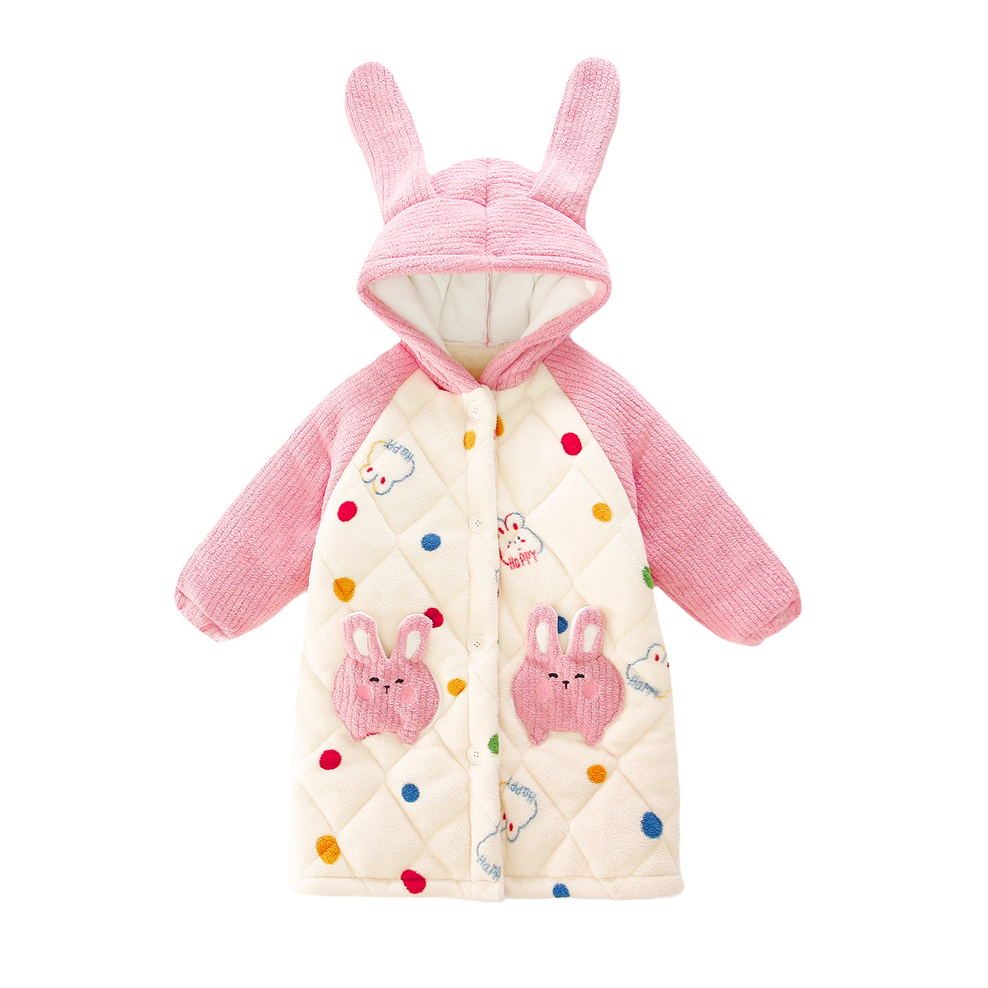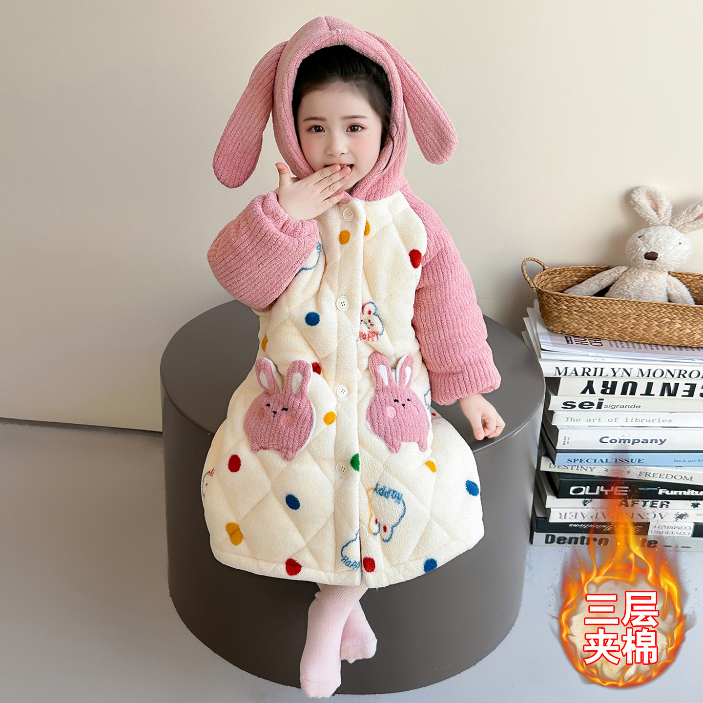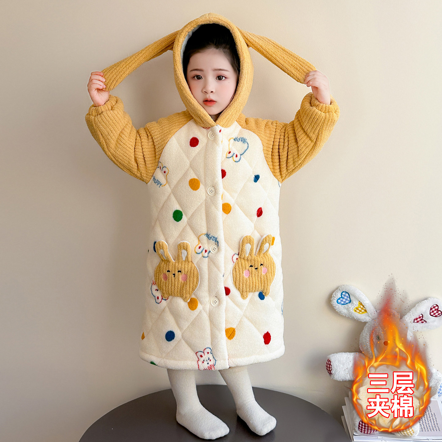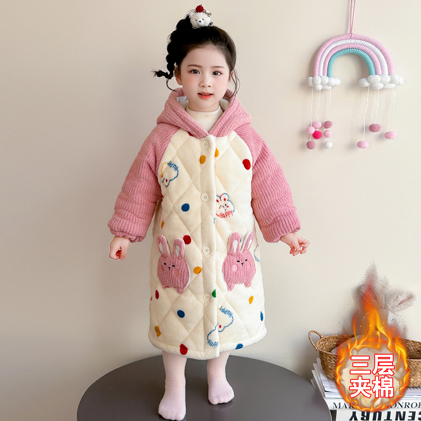 📚 女童睡袍冬季三层夹棉雪粒绒彩点兔浴袍儿童睡衣女孩法兰绒家居服