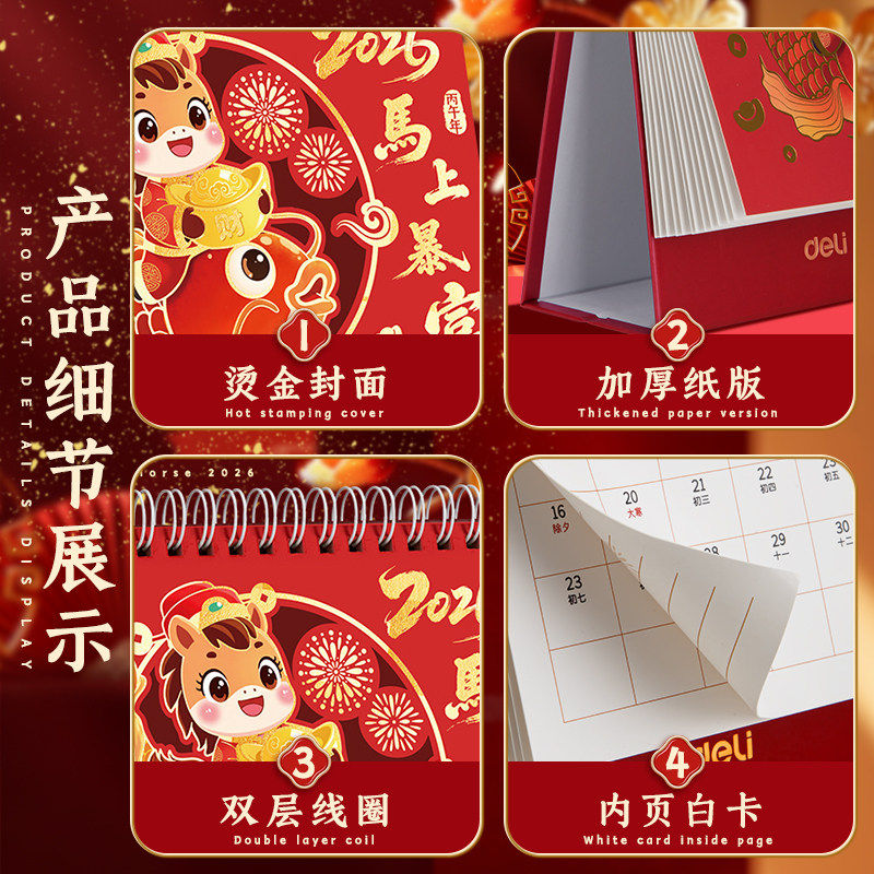 📚 得力2026年新款台历日历马年新年卡通烫金迷你办公室桌面万年历摆件可爱月历倒计时记事本活动日程计划表周历