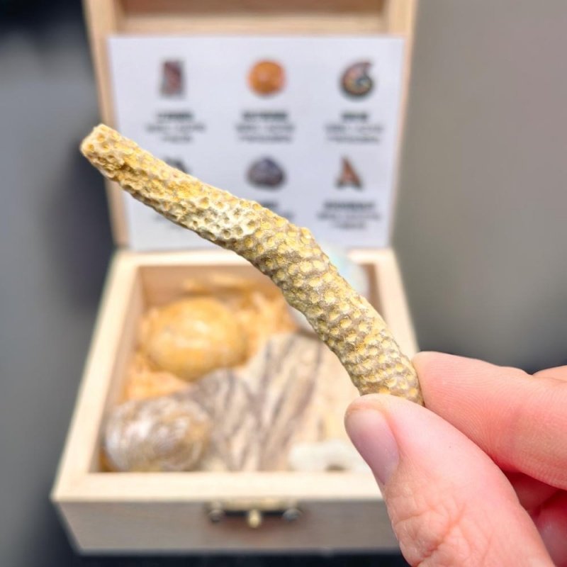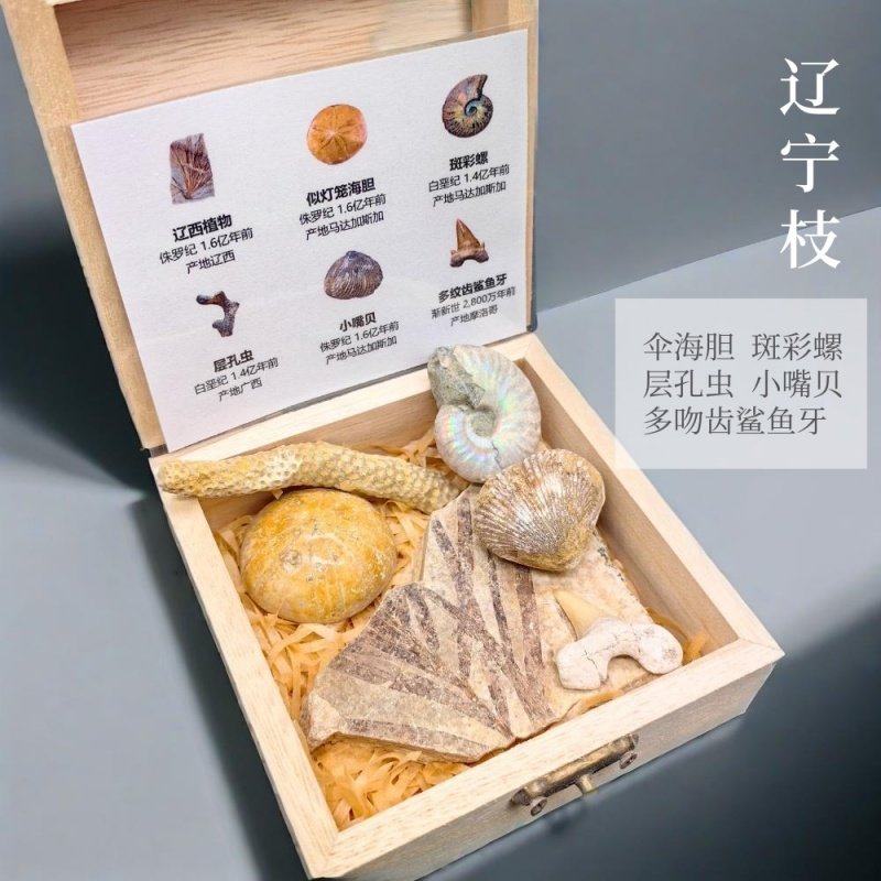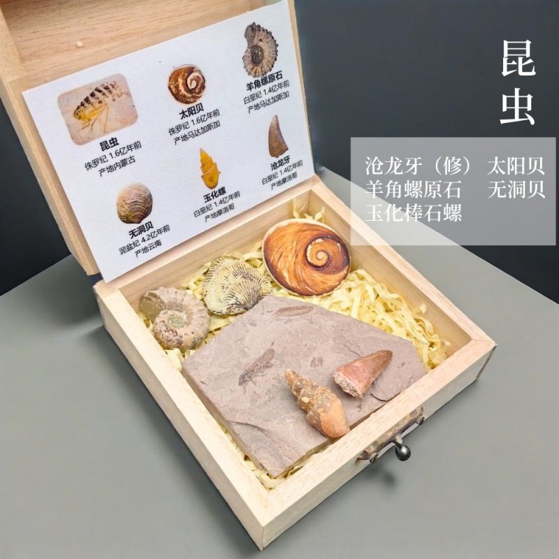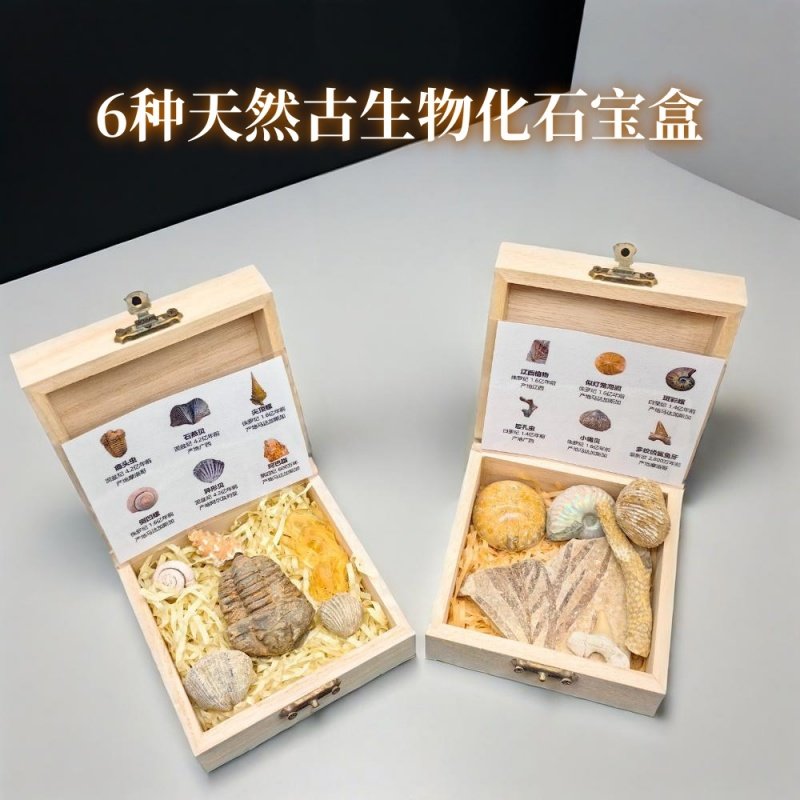 📚 6种天然古生物化石标本宝盒鲨鱼牙三叶虫菊石鱼植物科普礼物摆件