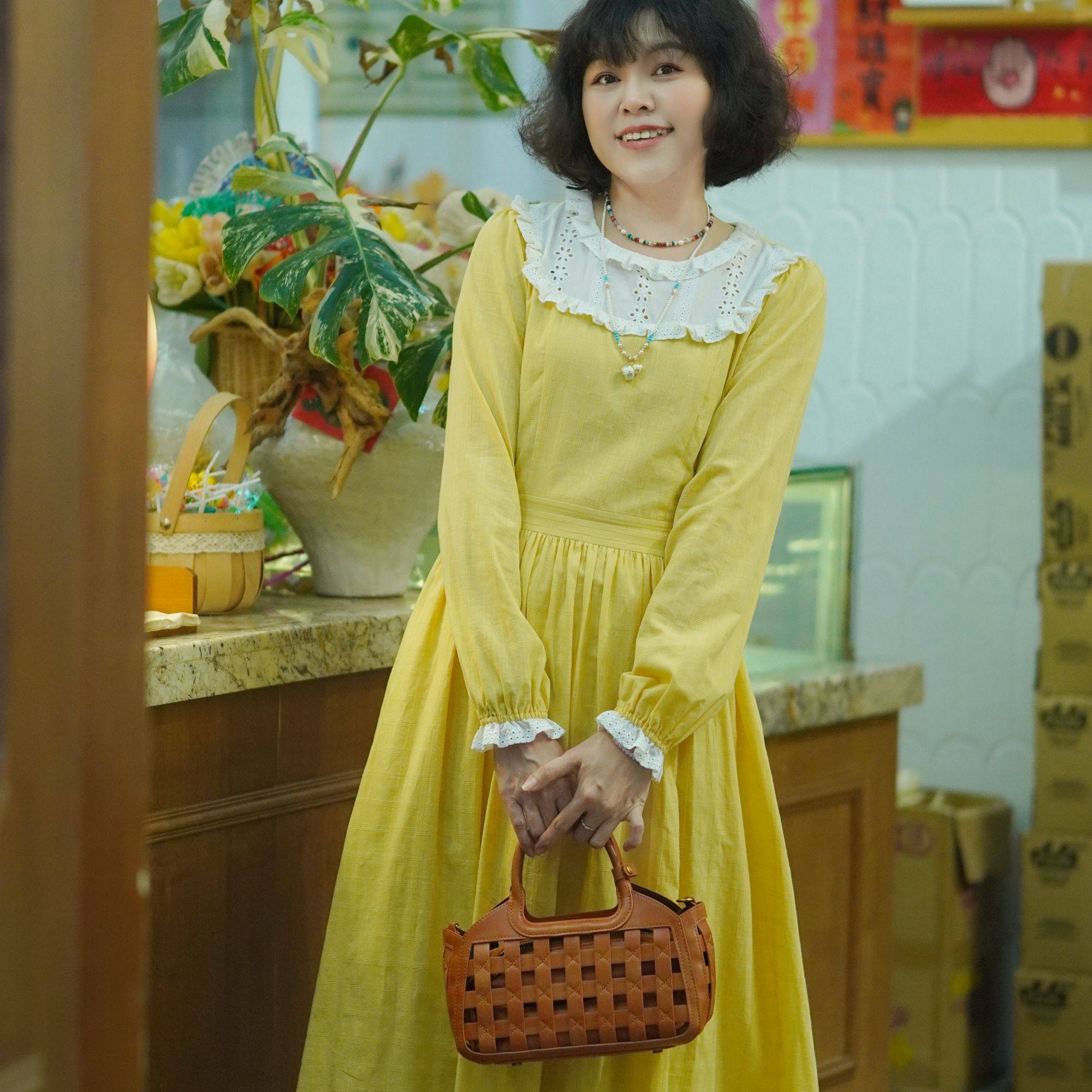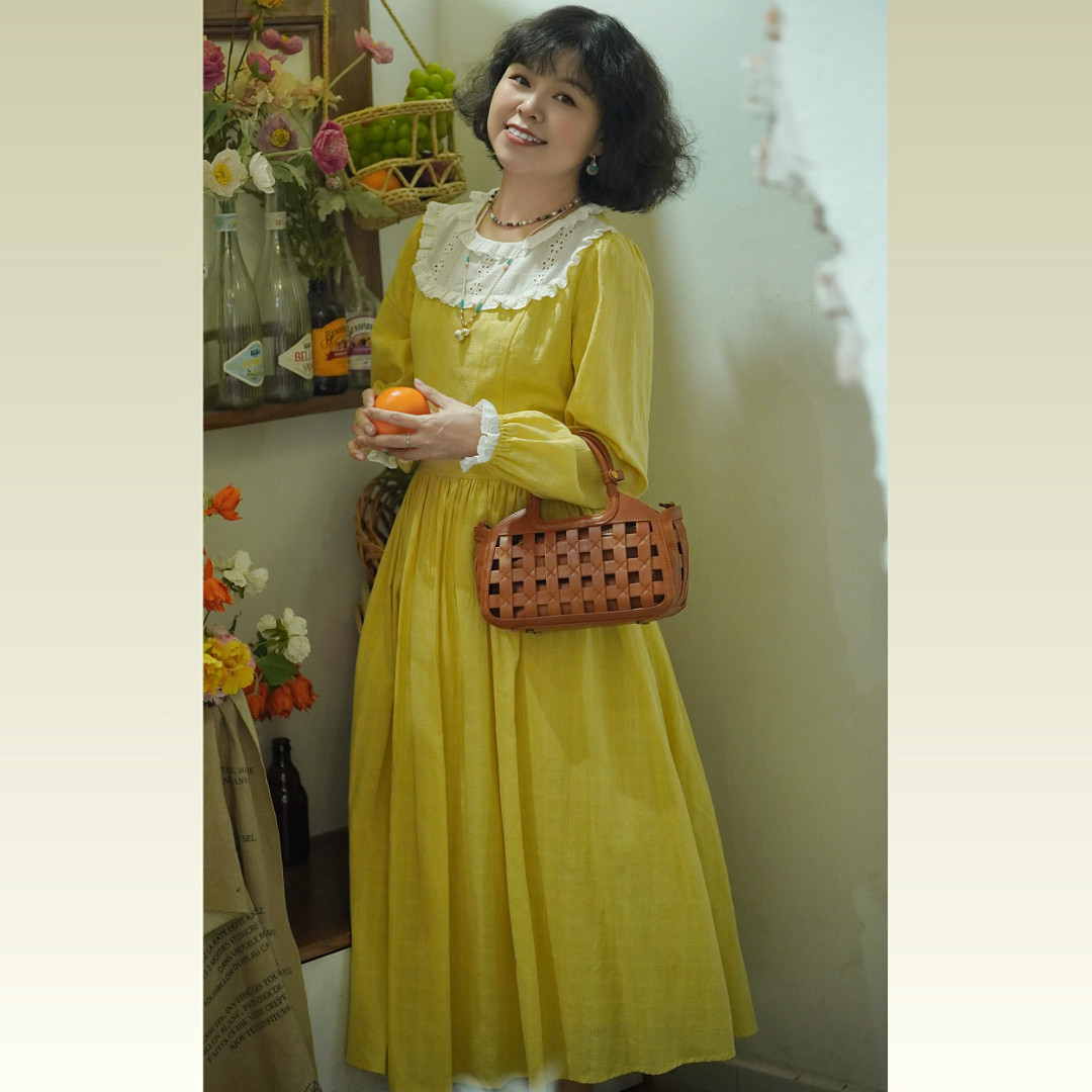 📚 (秋日来信)法式复古宫廷风撞色花边领长袖连衣裙女秋新款黄裙子