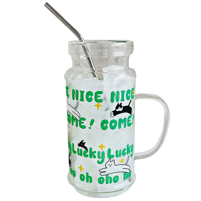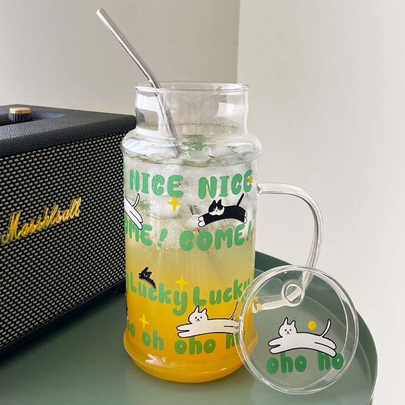 📚 1100ml玻璃杯大容量一人饮水壶卡通高颜值水杯带盖带吸管家用杯子