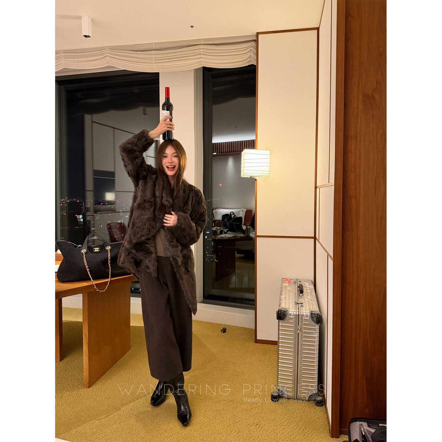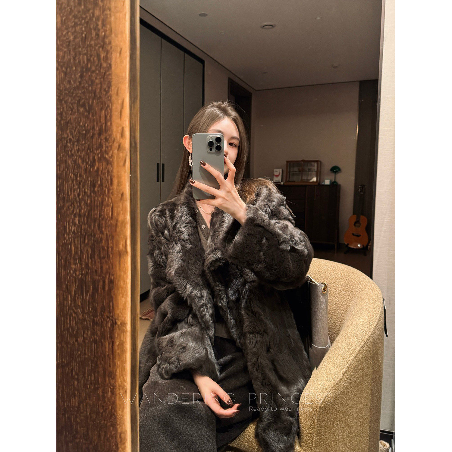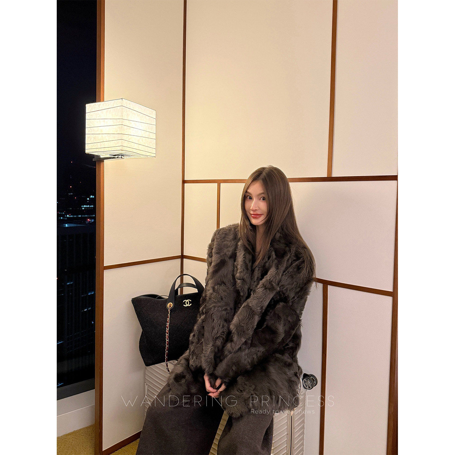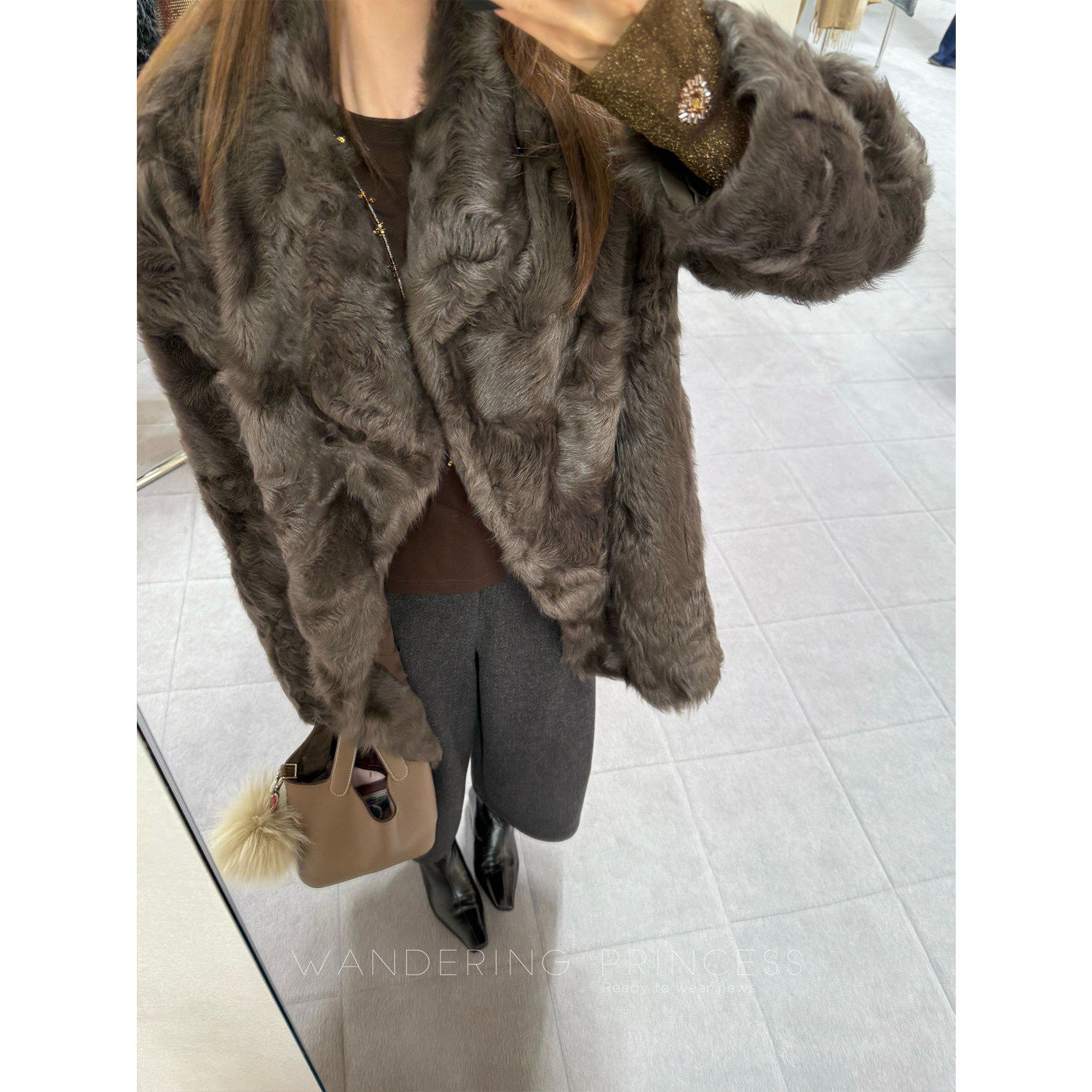 📚 钱美西 奢级小湖羊稀缺奢贵 软宝石皮毛一体皮草中长翻领廓形外套
