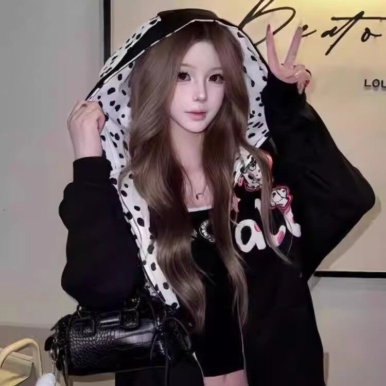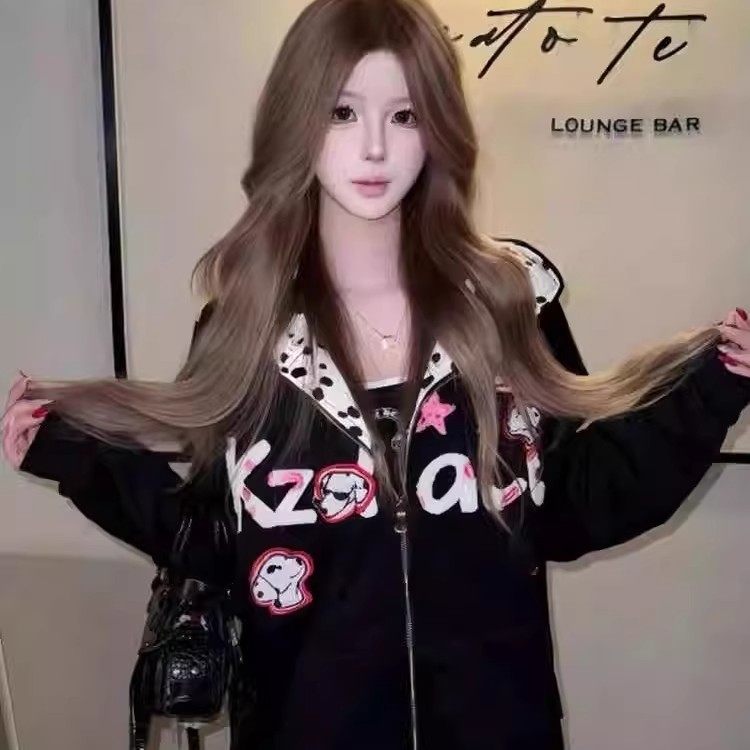 📚 黑色斑点狗字母刺绣连帽卫衣女秋冬季加绒加厚设计感小众开衫外套