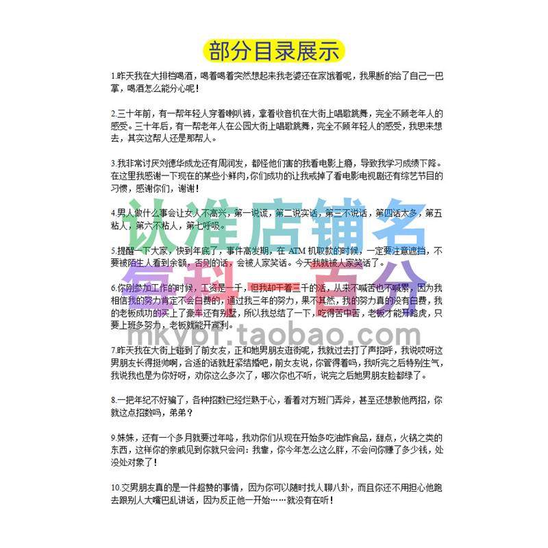 57¥ CZ356 kVlSUiESsgD¥ https://m.tb.cn/h.7rHqbiM 直播脱口秀话术搞笑吐槽土味情话主播幽X默笑话气氛顺口溜段子大 --------------------- 【原售价】10元 【现售价】10元。