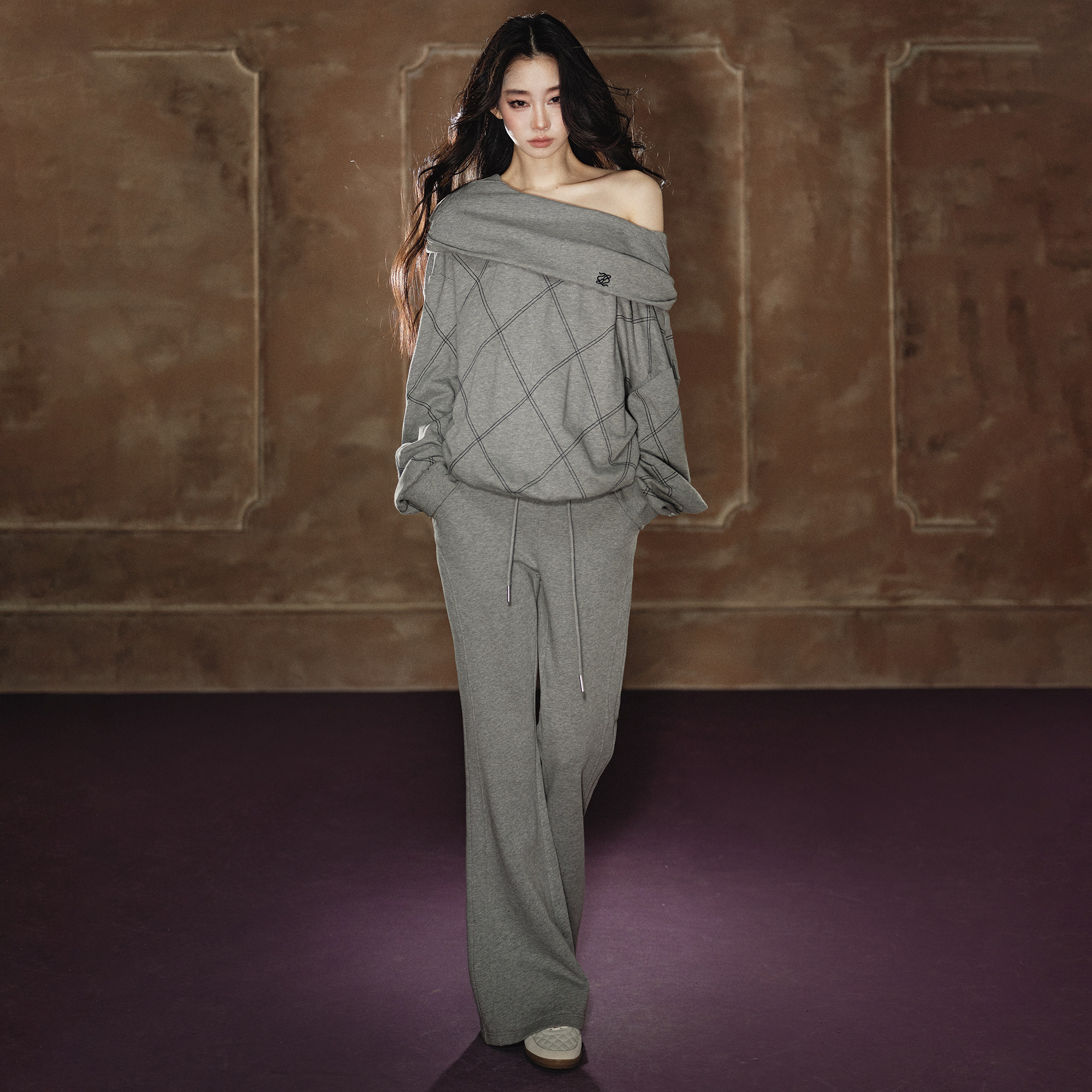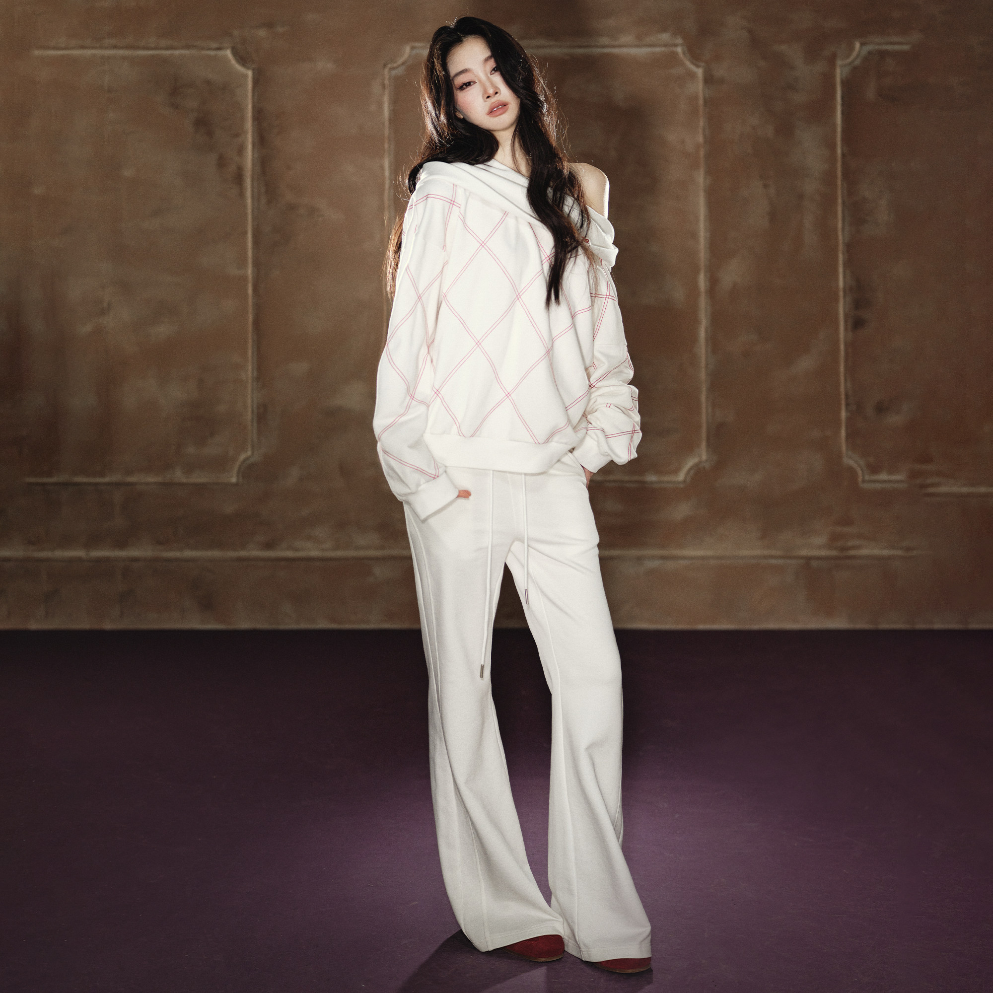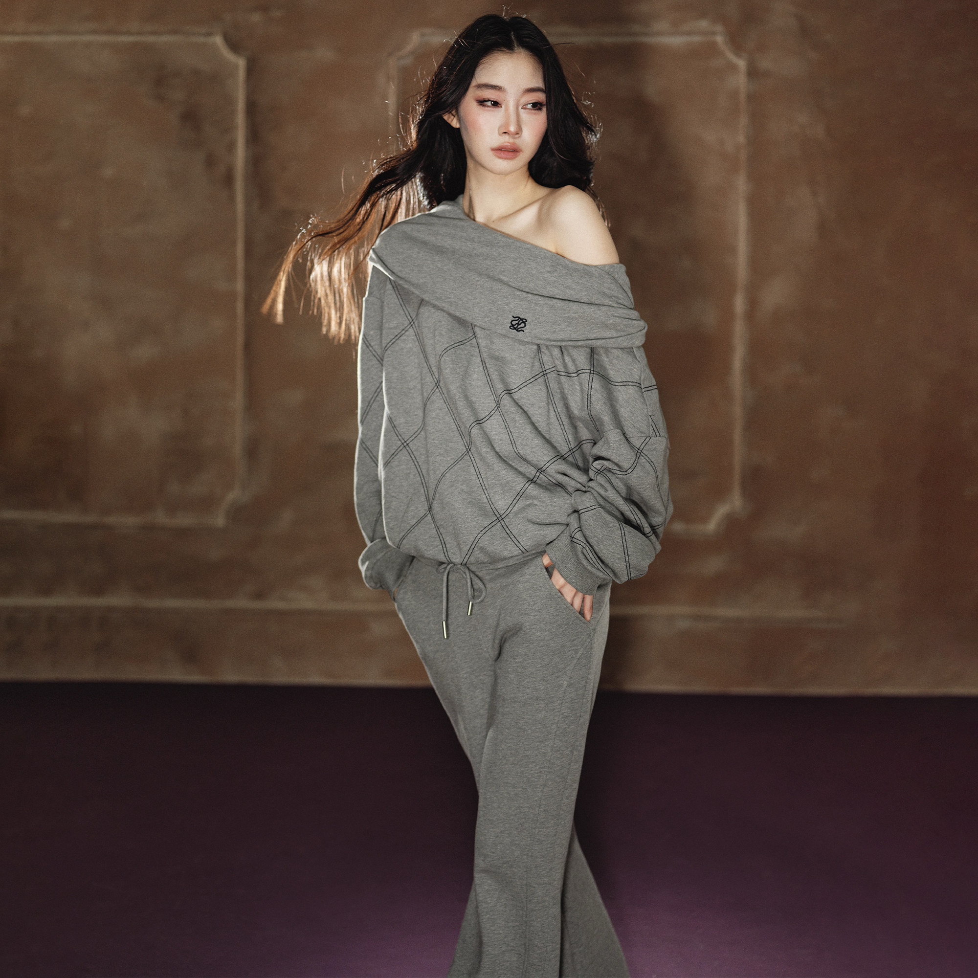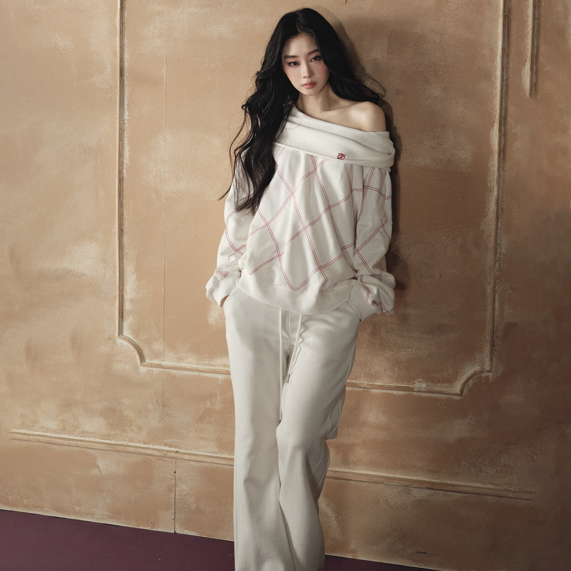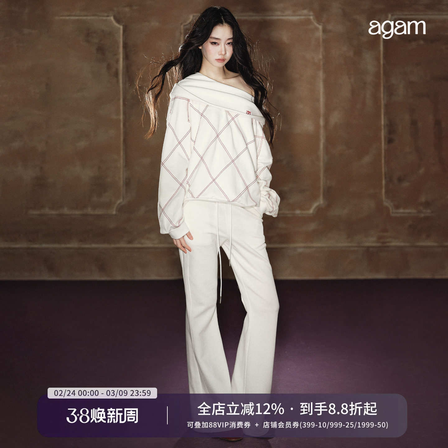 📚 AGAM 一字肩斜领露肩撞色卫衣菱格米粒绣上衣+微喇卫裤阔腿休闲裤
