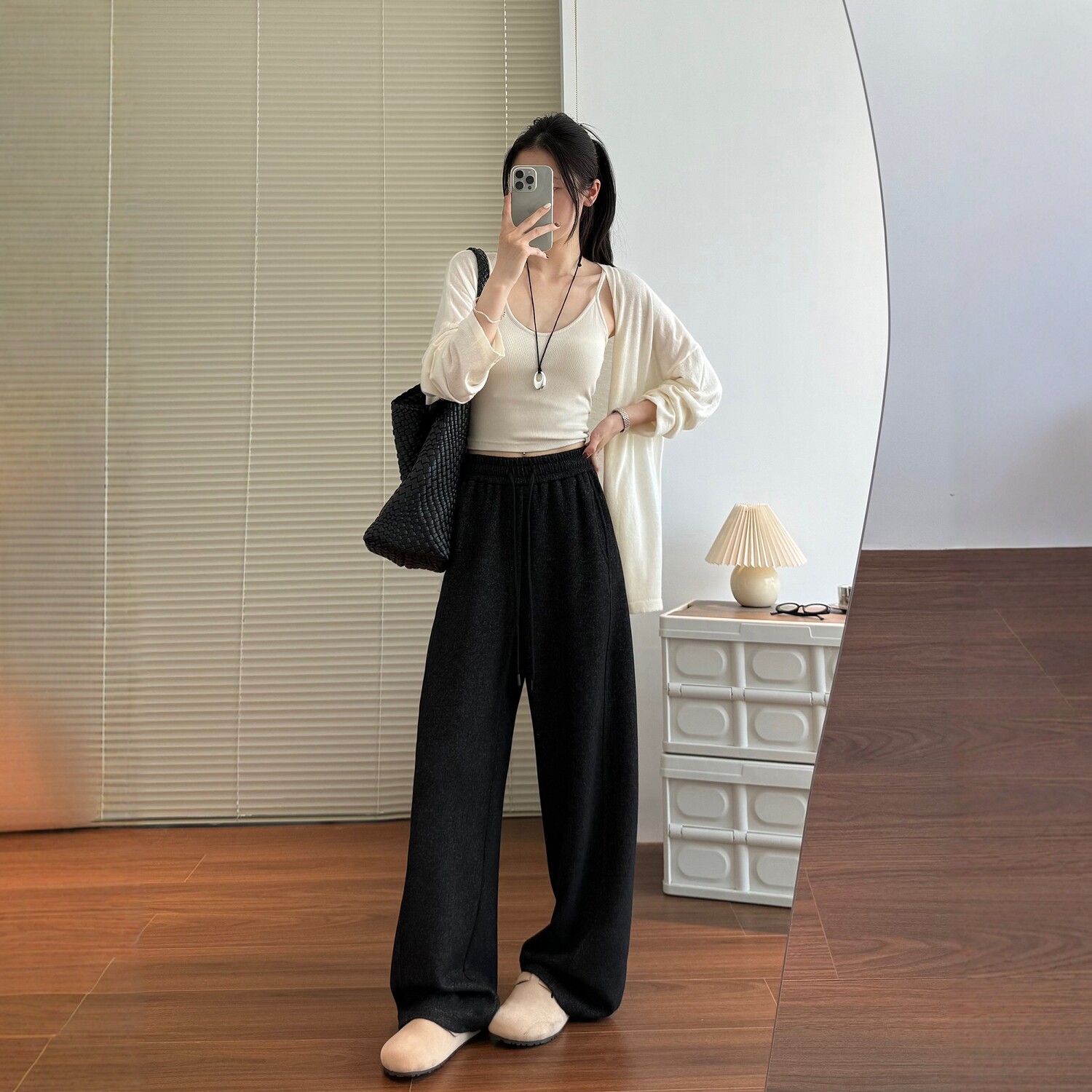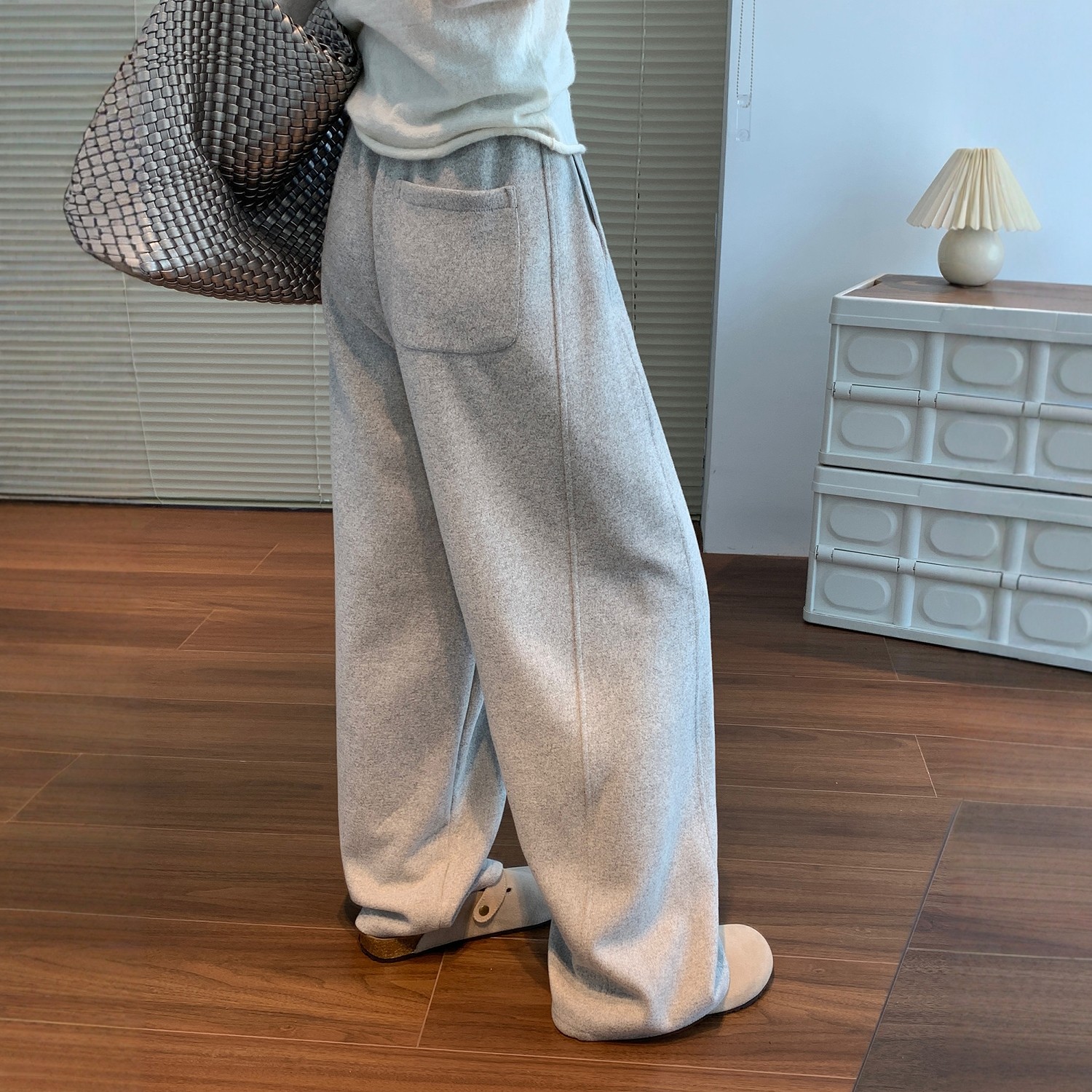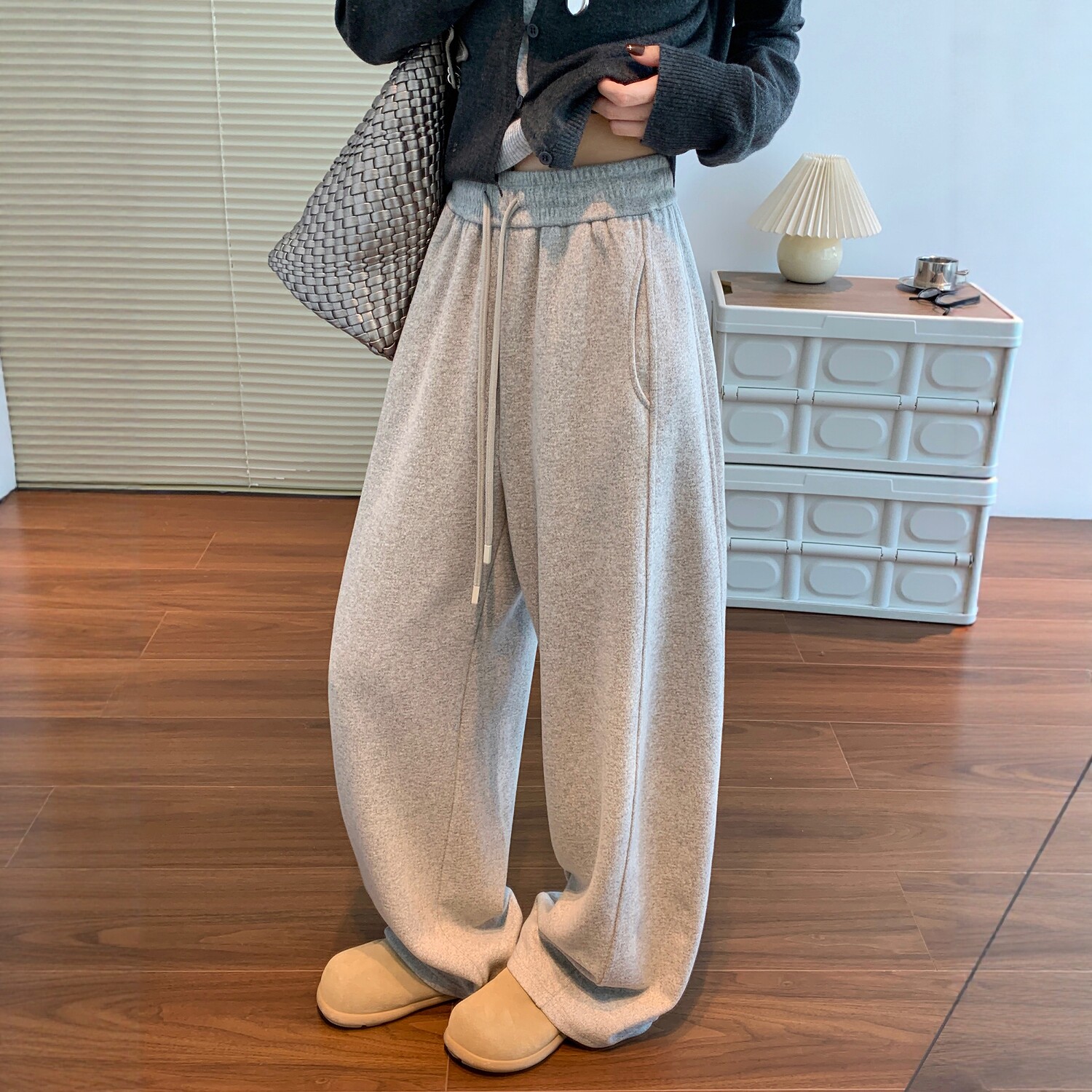 📚 灰色阔腿裤女秋冬加绒加厚垂感弯刀裤子宽松显瘦羊毛针织运动卫裤