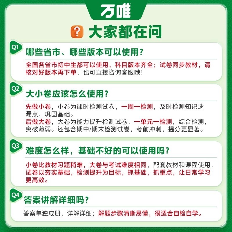 总的来说,这款“2026春万唯中考大小卷全套初中初一初二小四门试卷测试卷”真的是一款非常值得购买的初中学习资料。如果你正在为考试做准备或者想提高自己的学习能力,那么这款试卷绝对是你的不二之选!