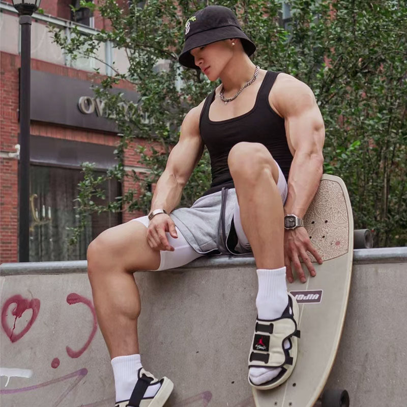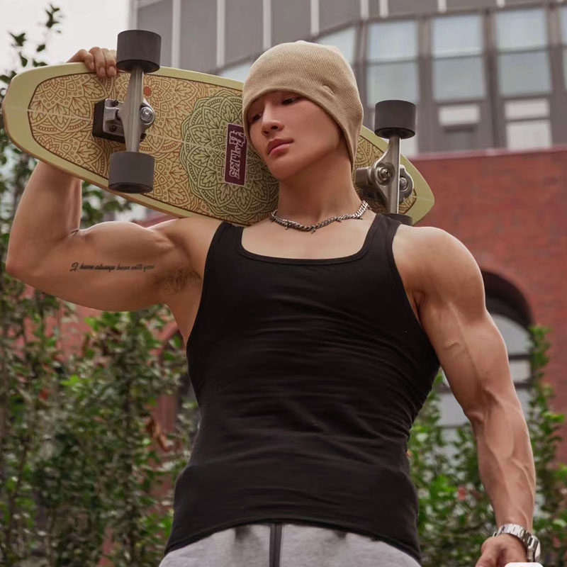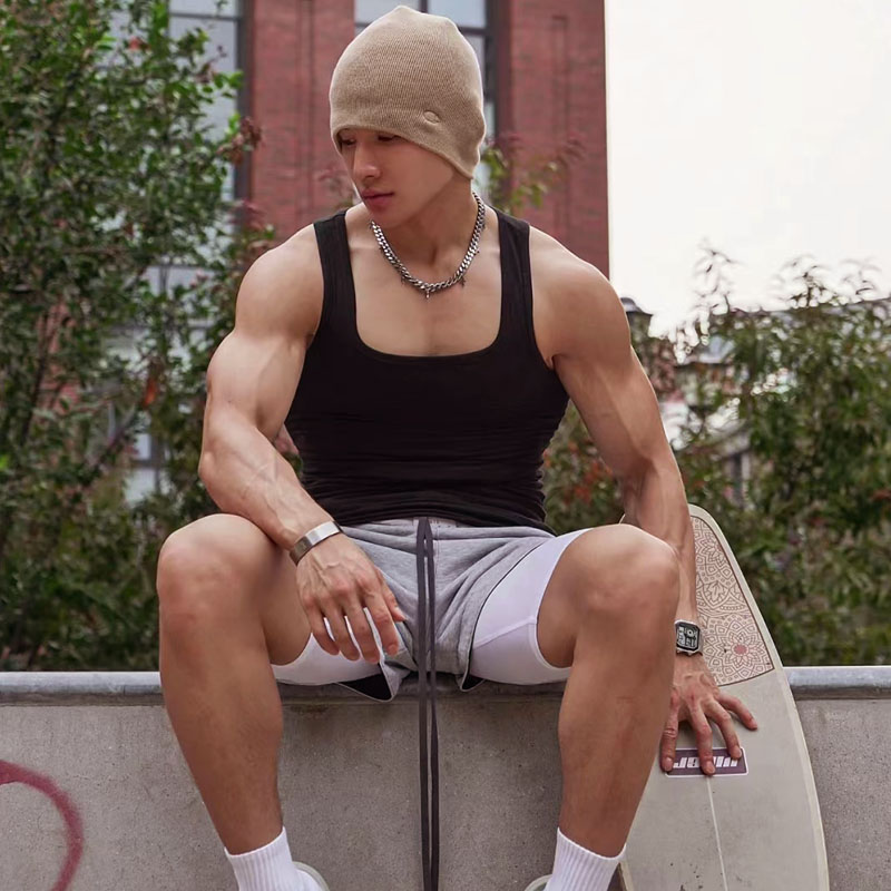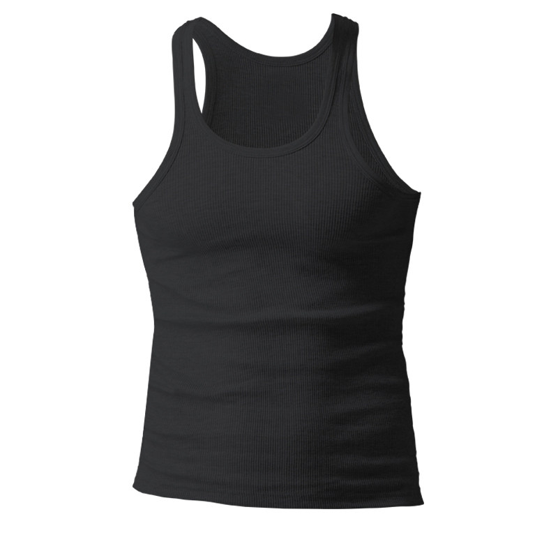 📚 一字低胸宽口方领粗螺纹高弹背心男黑色大码运动健身吸汗透气吊带