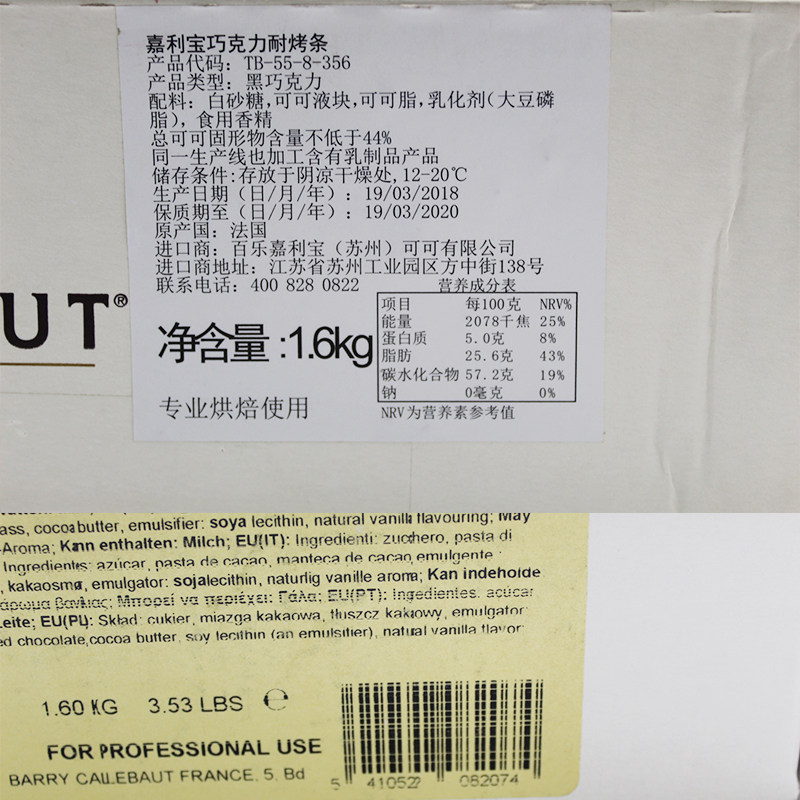 📚 嘉利宝耐烤入炉巧克力条1.6kg 法国原装进口耐高温蛋糕脏脏包烘焙