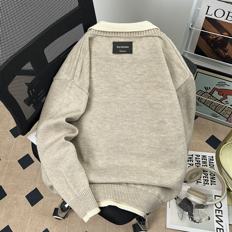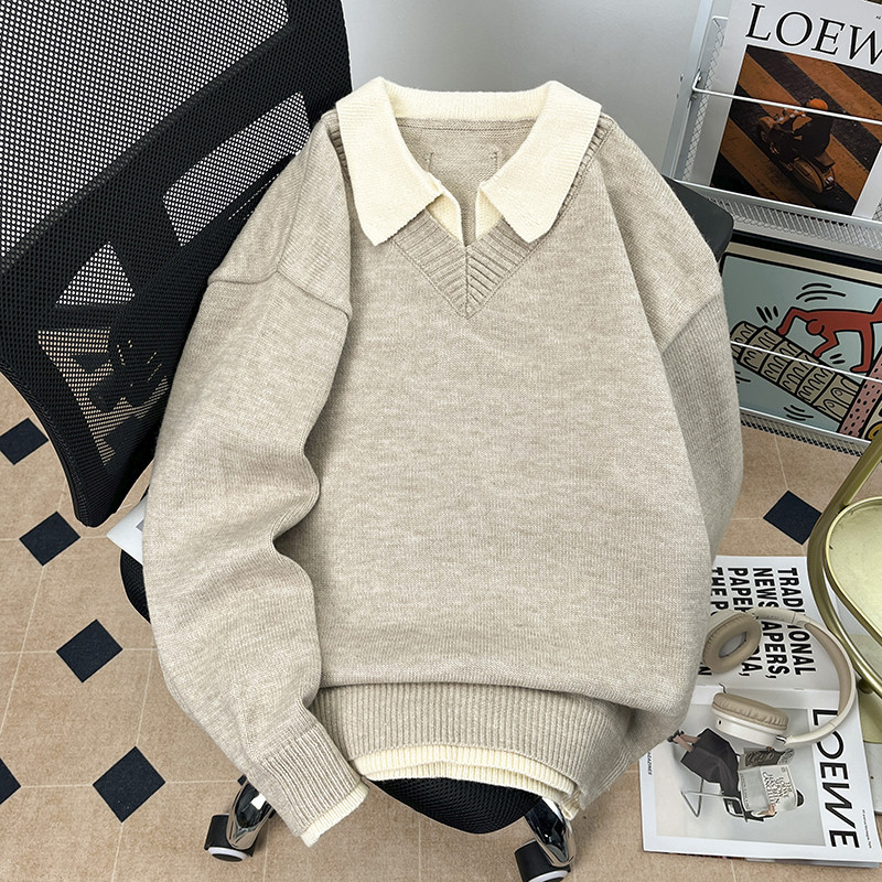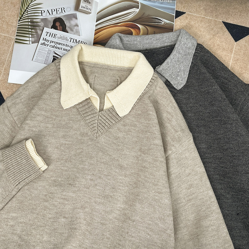 📚 翻领假两件毛衣男女款慵懒松弛感秋冬polo衫韩版上衣V子口针织衫