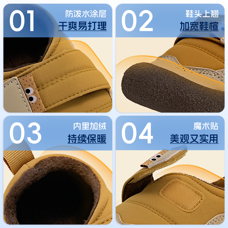 🔍特别值得一提的是它的加厚防滑设计。雪地靴的底部采用了特殊的防滑材料,即使在湿滑的雪地中也能保持稳定,让小朋友在玩耍时更加安全。