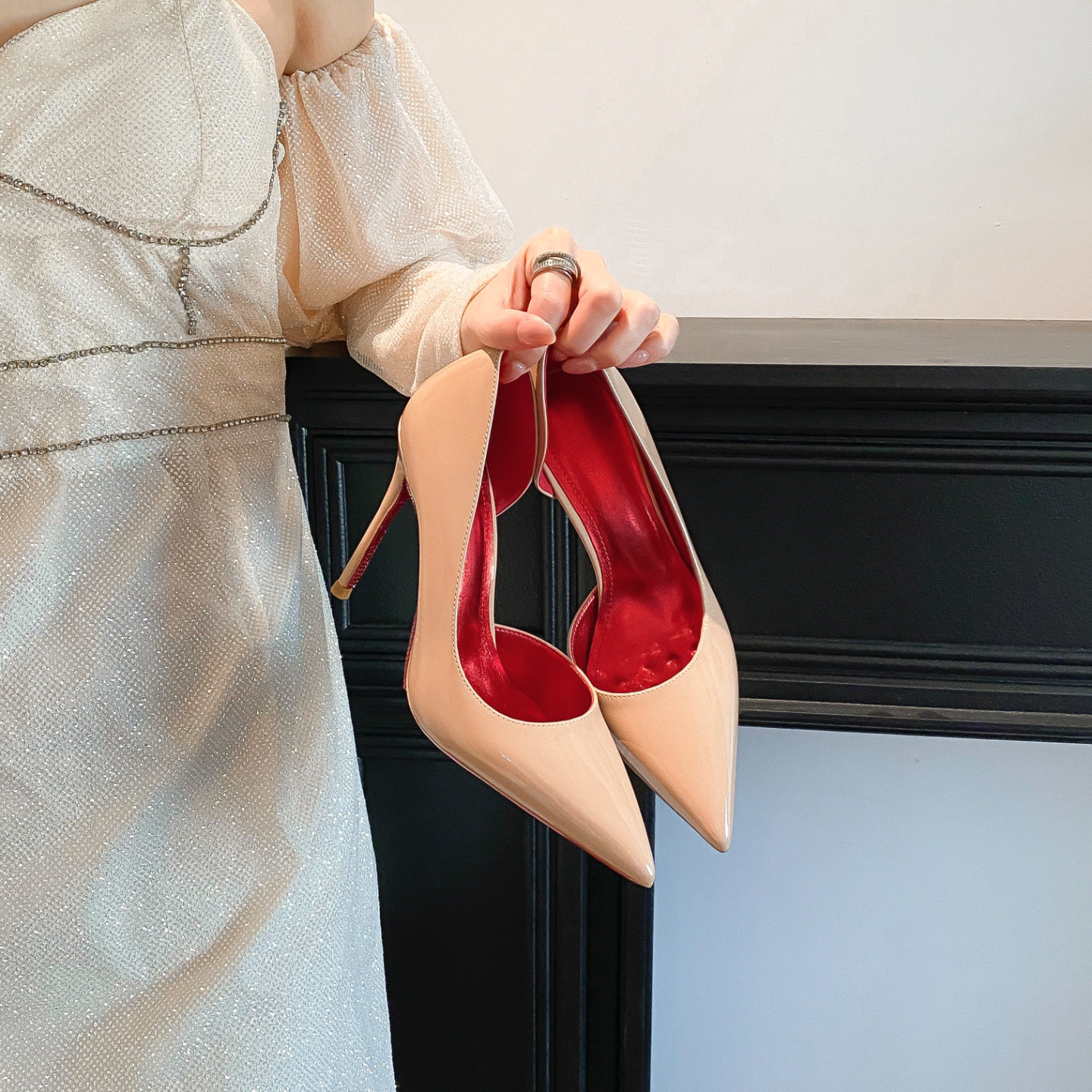 📚 水钻红底漆皮尖头高跟鞋侧空气质细跟名媛单鞋御姐裸色OL2026通勤