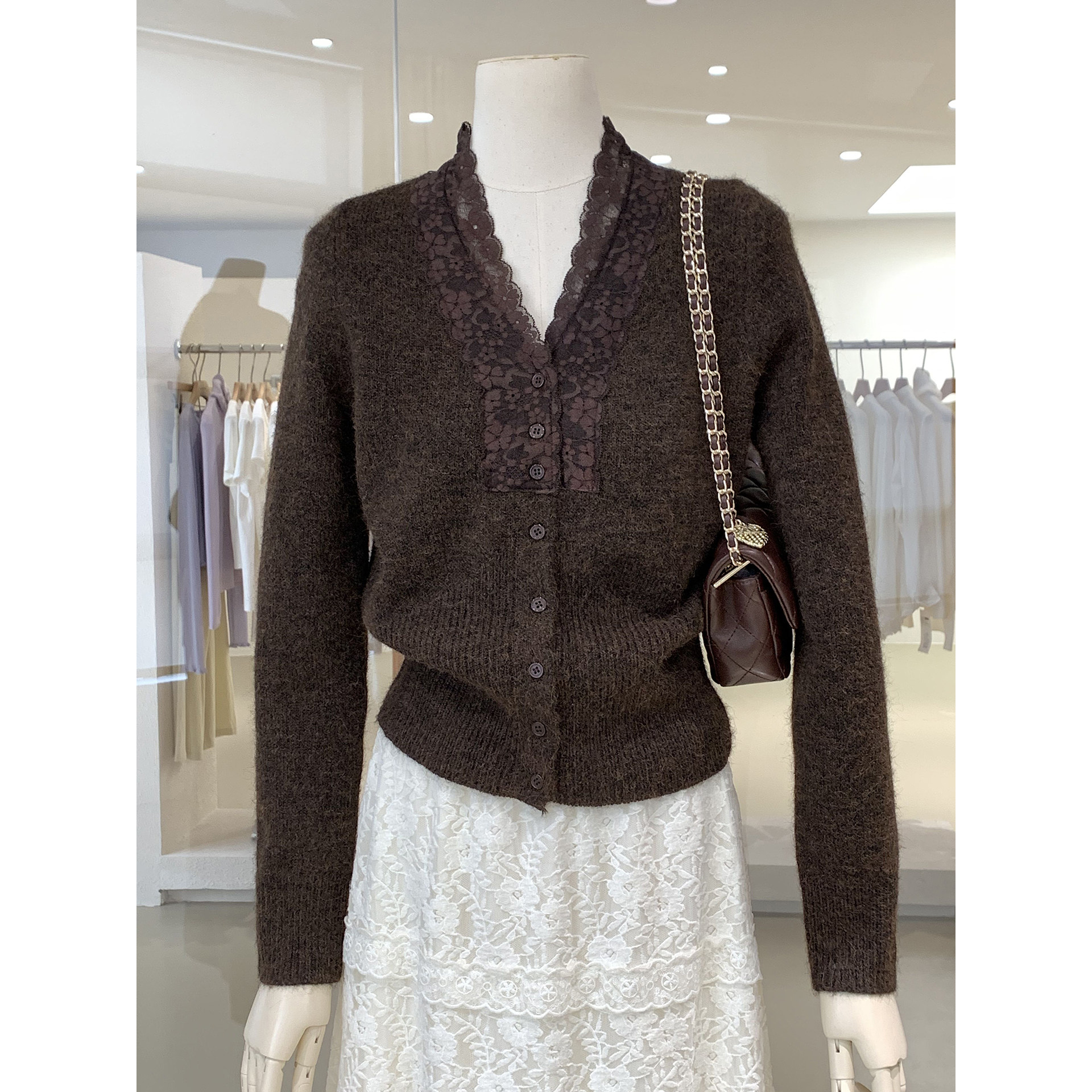 📚 拼接蕾丝花边V领毛衣秋冬新款温柔知性今年流行百搭针织衫上衣女