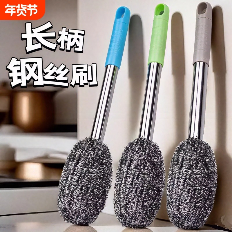 📚 带柄钢丝球刷子长杆洗锅清洁厨房洗碗瓶罐长柄不锈钢手柄去污加长