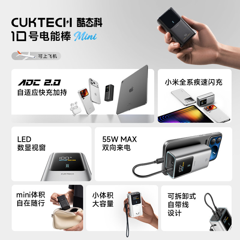 📚 【充电宝3C认证】CUKTECH酷态科10号mini电能棒电芯10000毫安时快充移动电源迷你小巧便携适用于iPhone苹果17