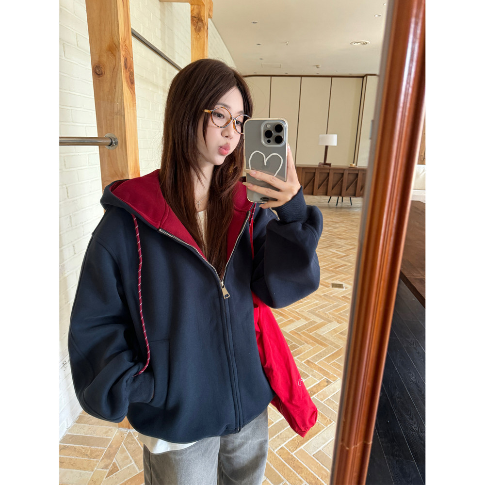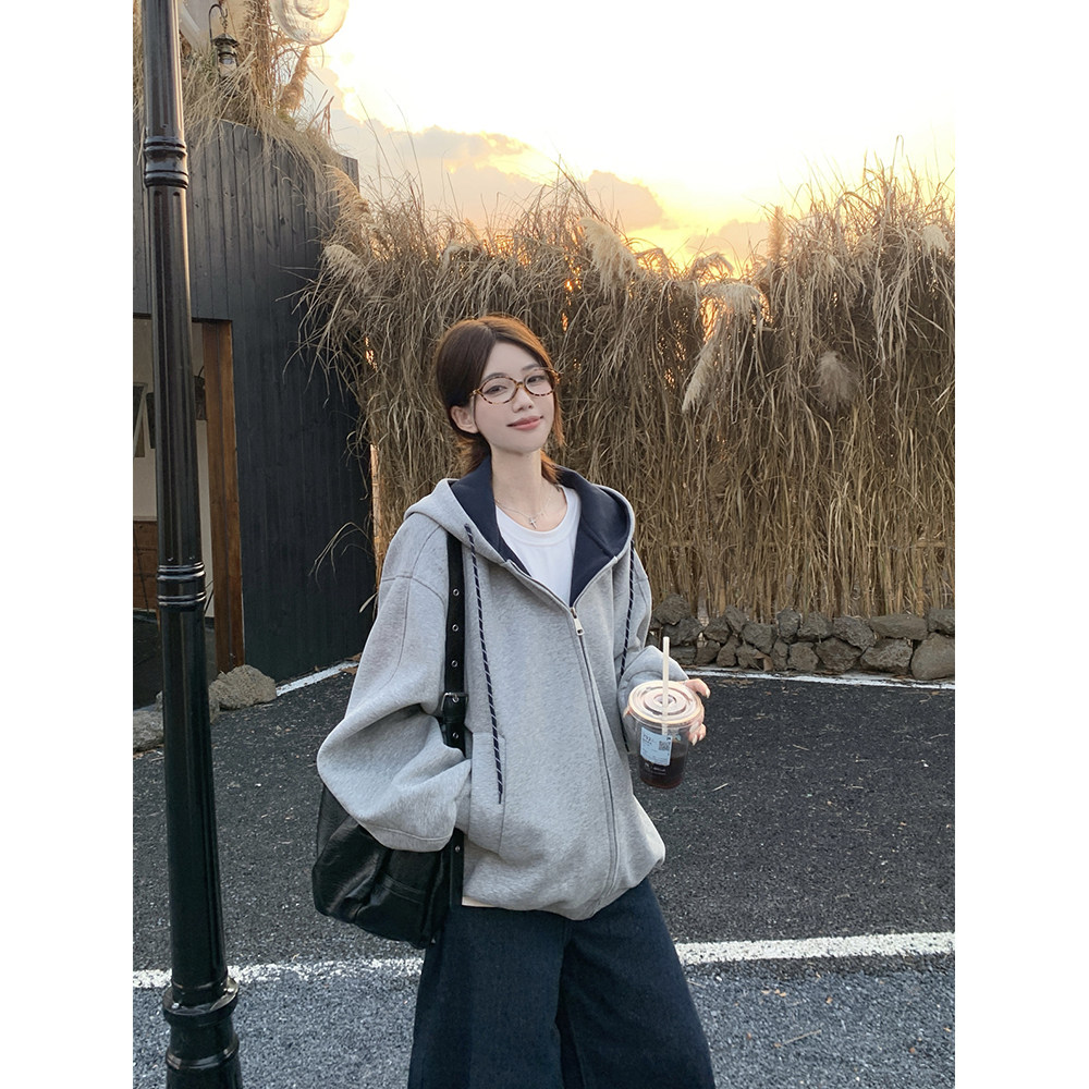📚 可可里~加绒加厚保暖连帽撞色卫衣女秋冬宽松灰色设计感外套上衣