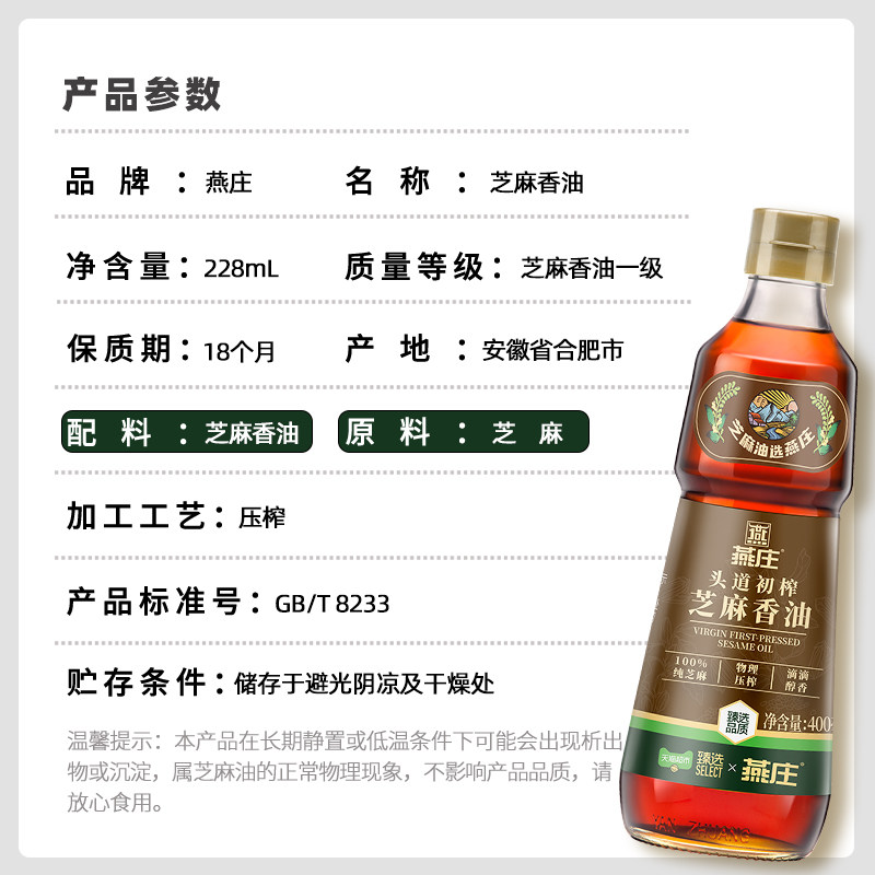 📚 【臻选】燕庄头道初榨芝麻香油400mL*1瓶压榨火锅蘸料凉拌拌面