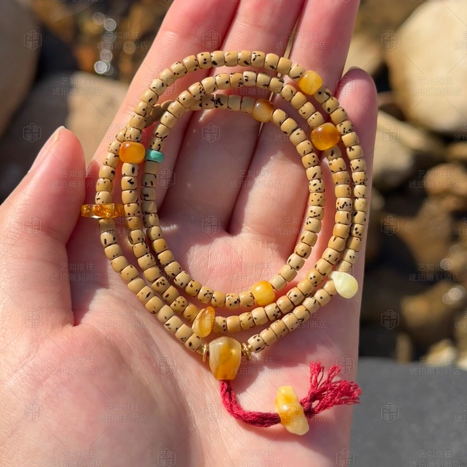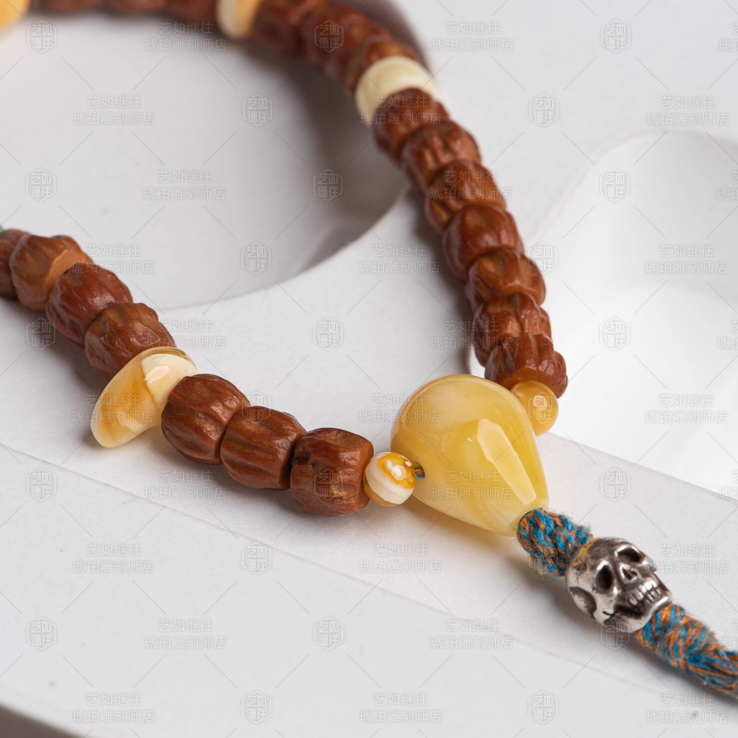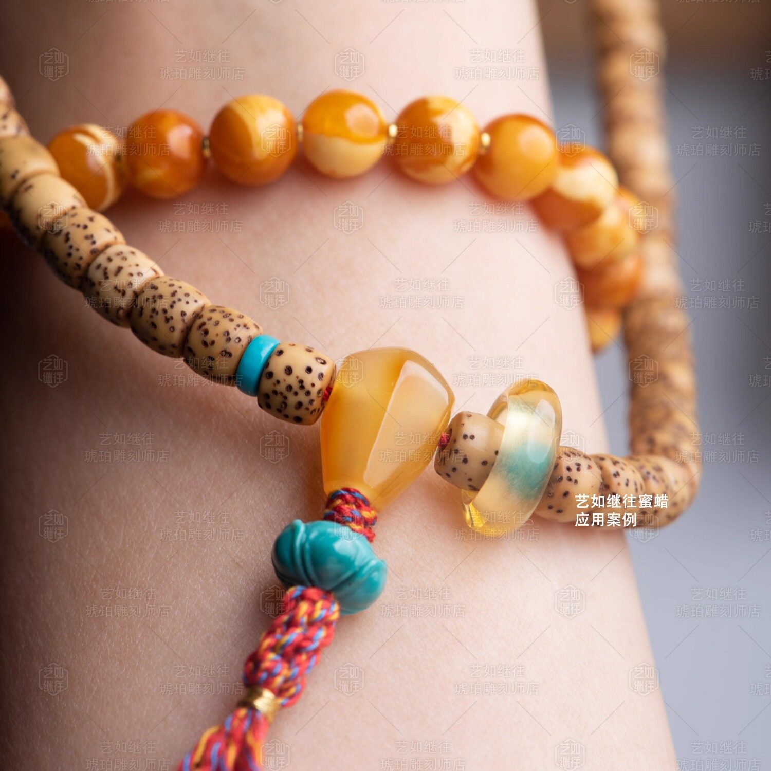 📚 艺如继往沙鱼鳍背三通天然蜜蜡大孔道米珠手串俏色迷你佛头鸡油黄