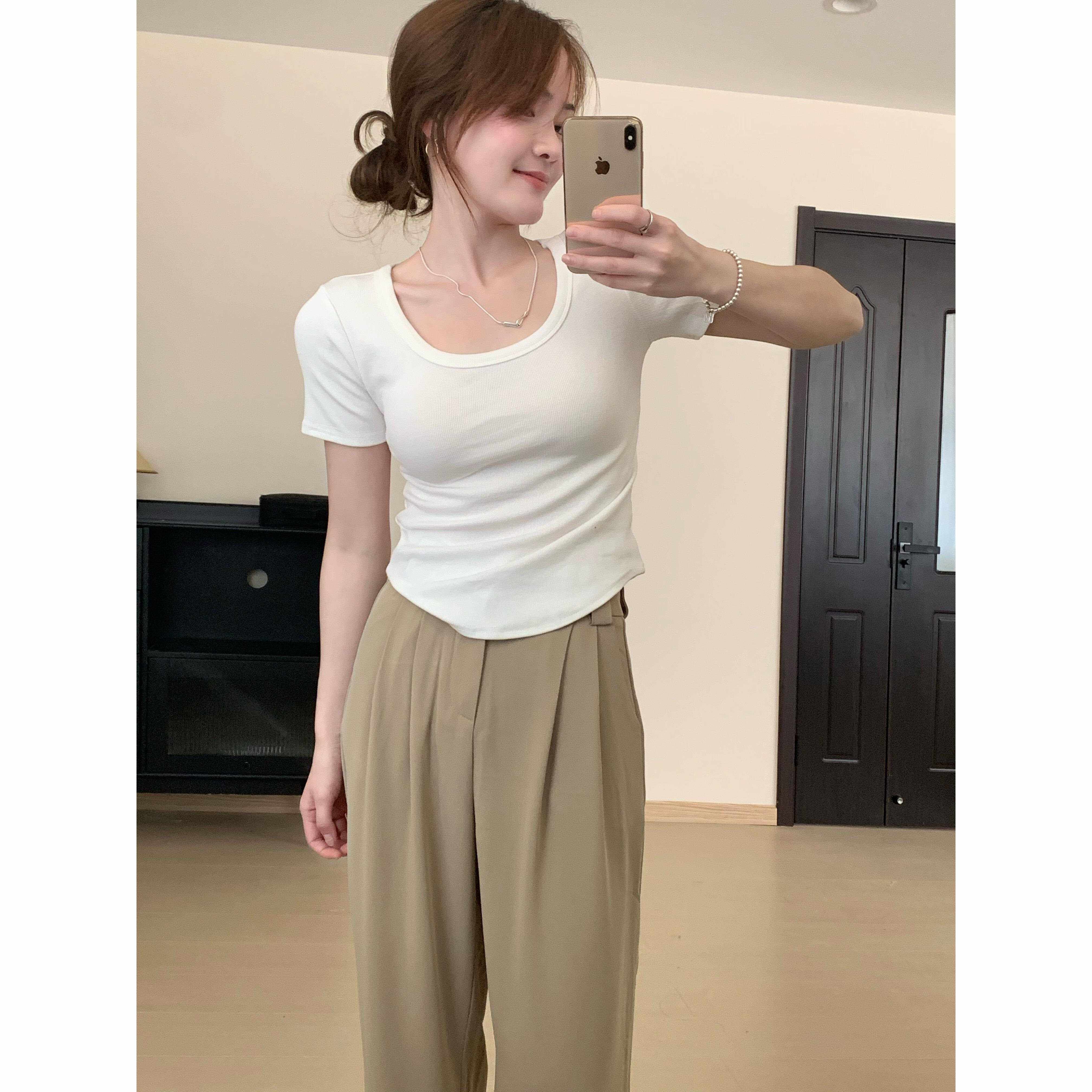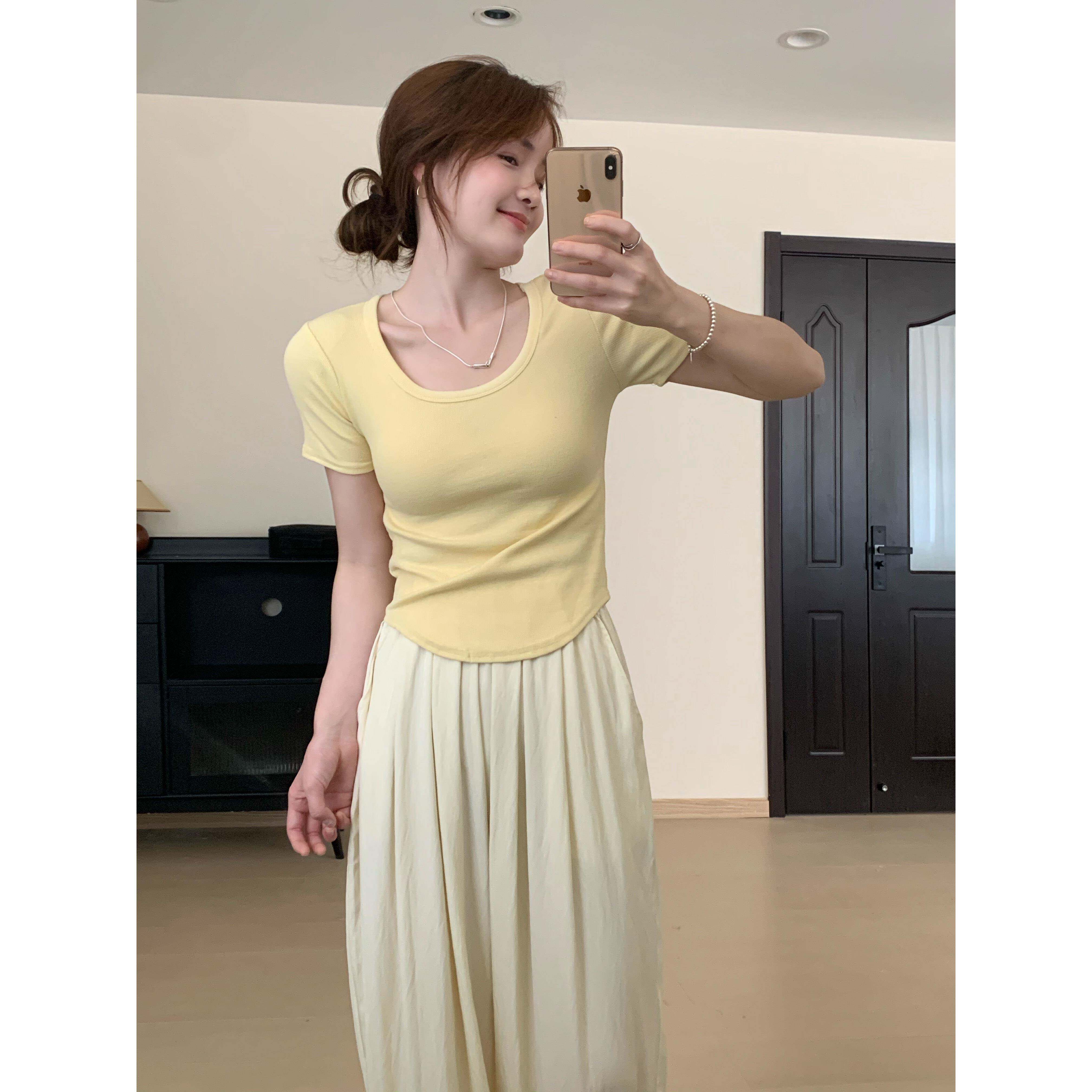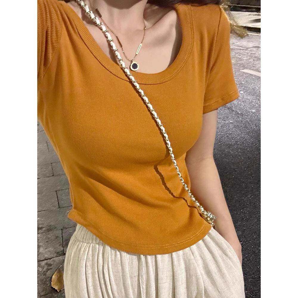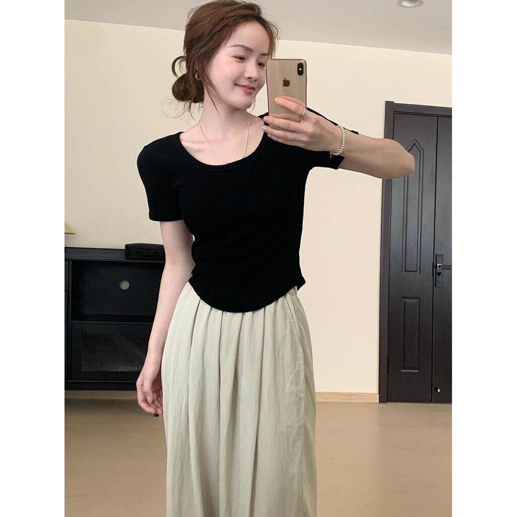 📚 夏季新款修身显瘦美式弧形下摆短袖t恤女小个子短款露锁骨上0224r