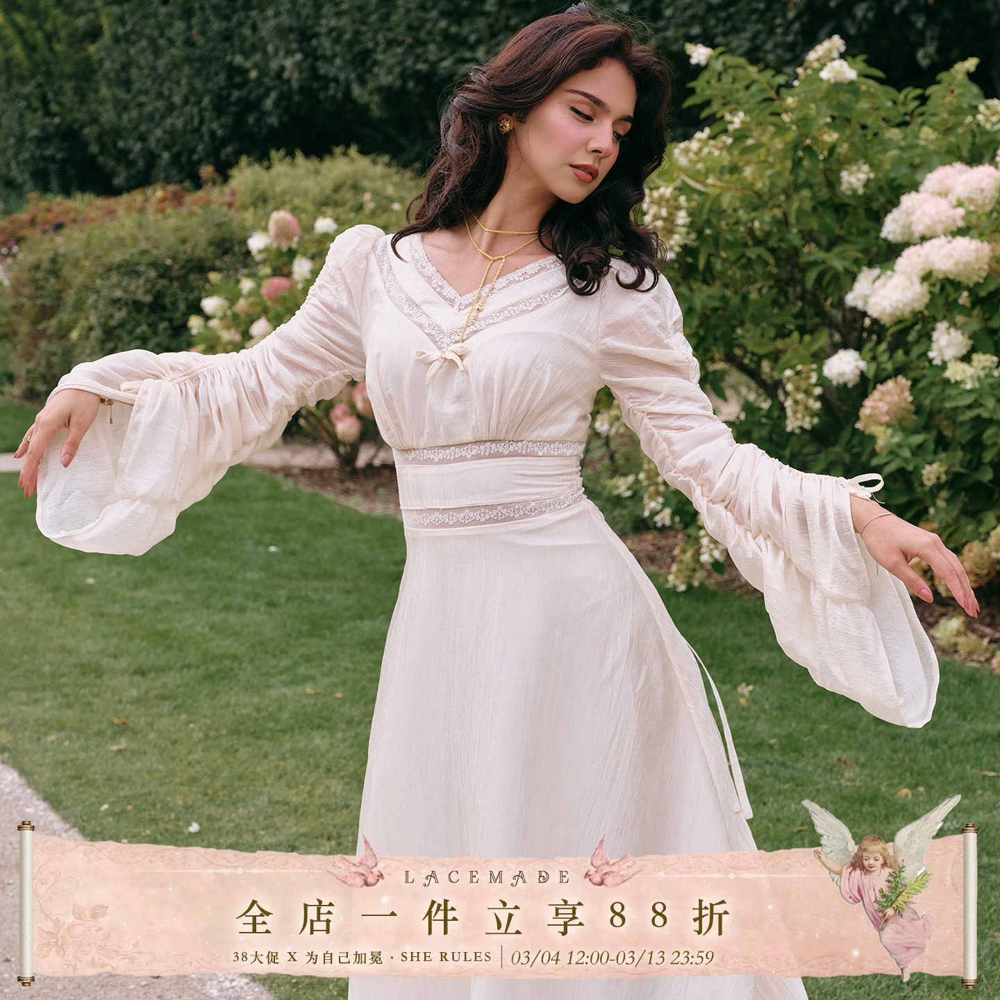 📚 LaceMade 流光圣咏 法式宫廷风纯白V领醋酸缎面白色掐腰连衣裙女