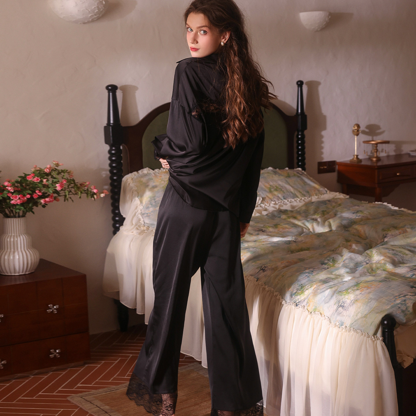 📚 夏何夕性感睡衣女大码宽松纯欲风冰丝家居服蕾丝衬衫长裤两件套
