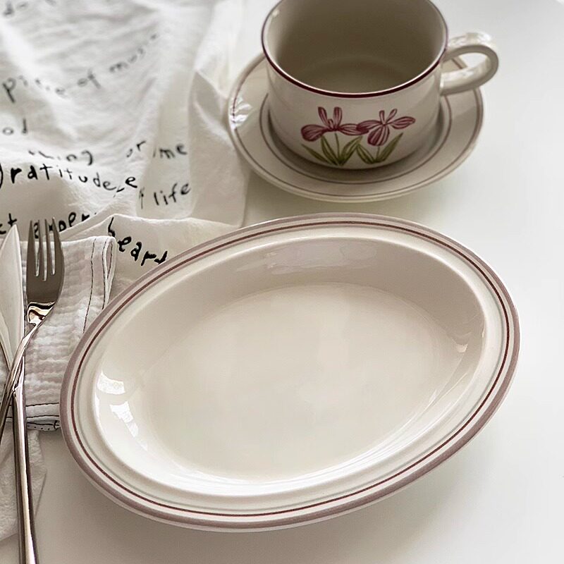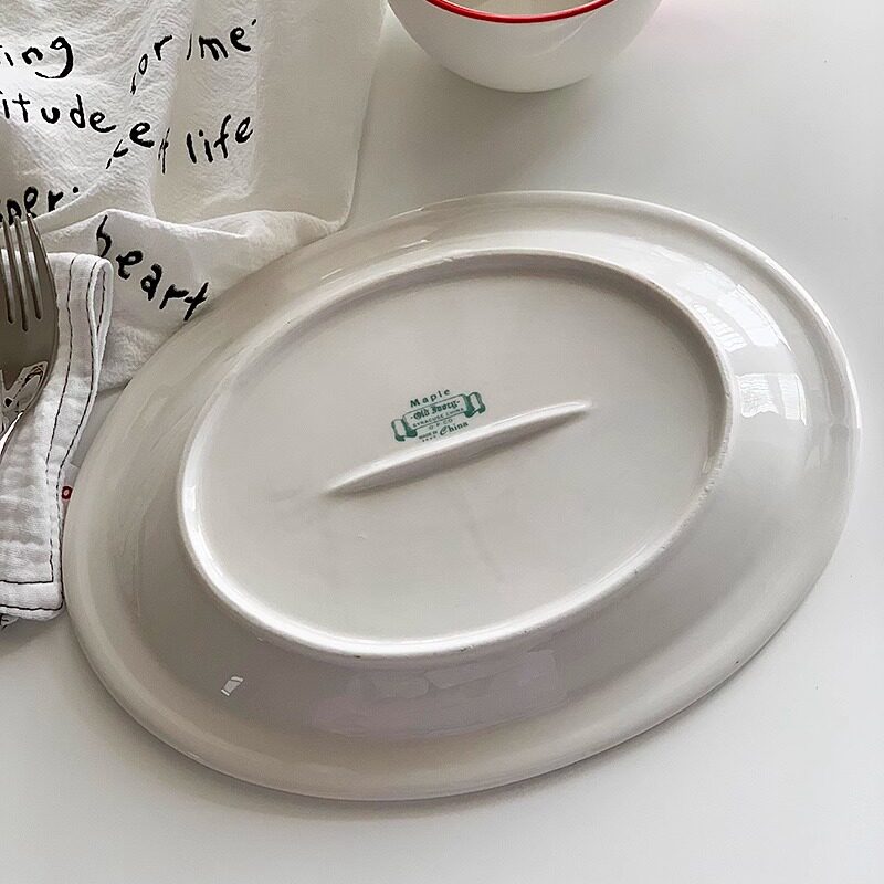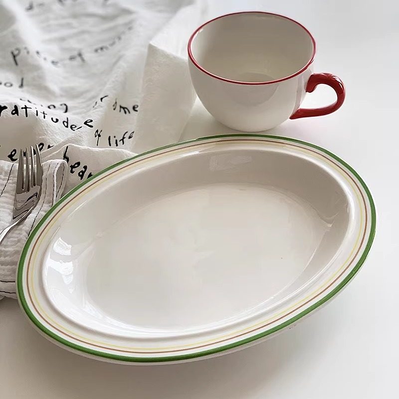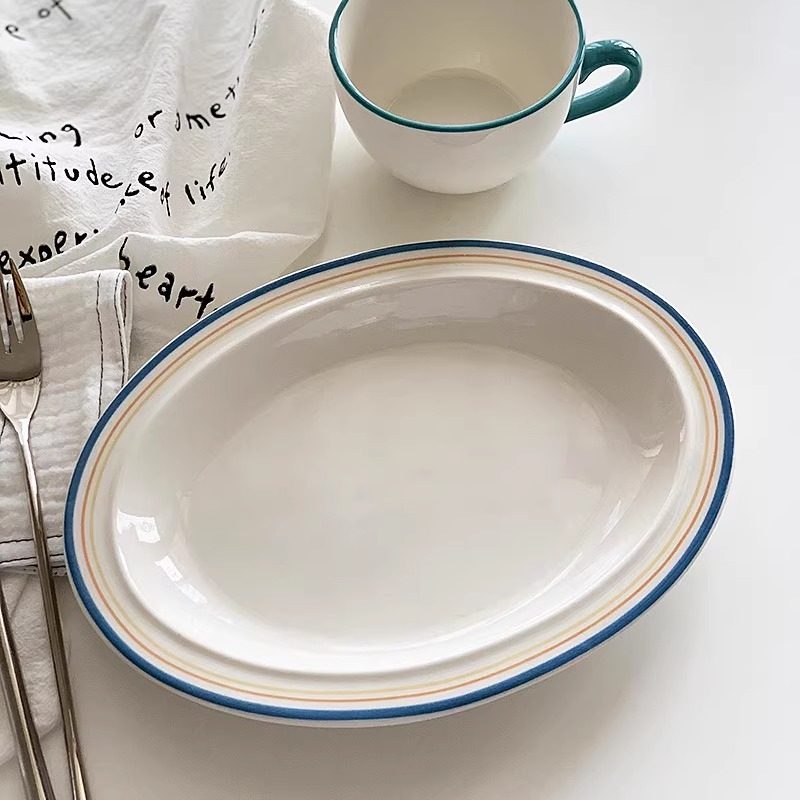 📚 安木良品 外贸原单 复古ins风线条描边陶瓷餐盘西餐厅家用椭圆盘