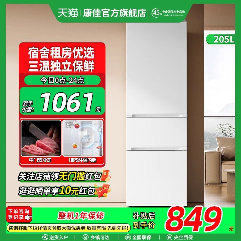 📚 康佳205L三门超薄租房宿舍小冰箱中层软冷冻三门三温大容量冰箱
