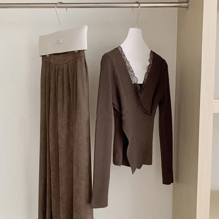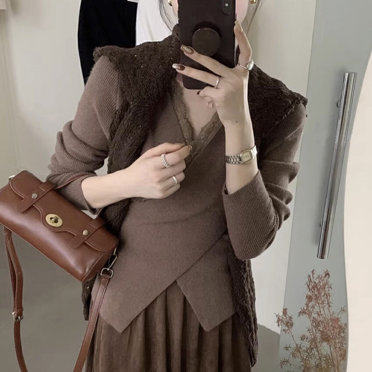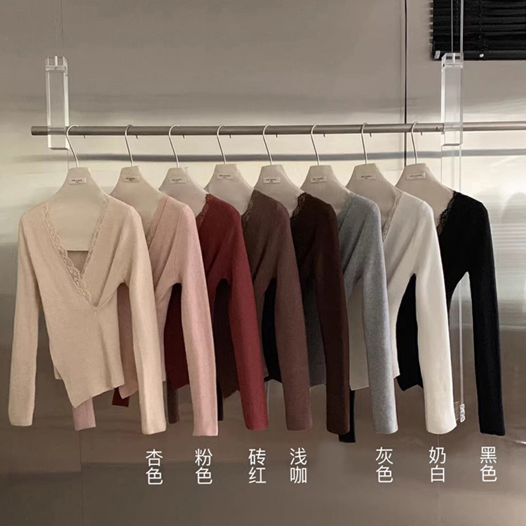 📚 秋冬新款ins洋气针织衫女v领交叉蕾丝内搭打底上衣设计感修身毛衣